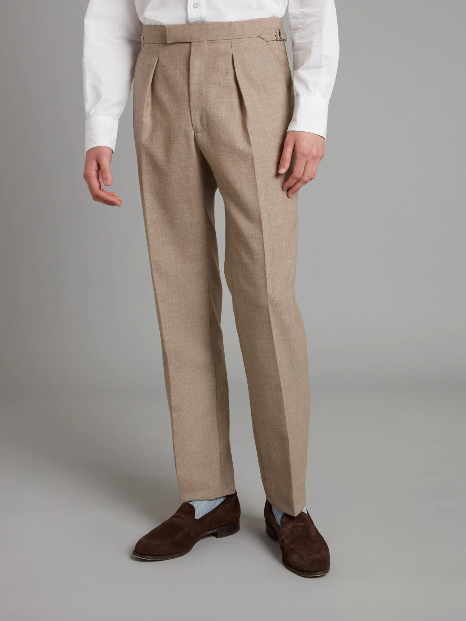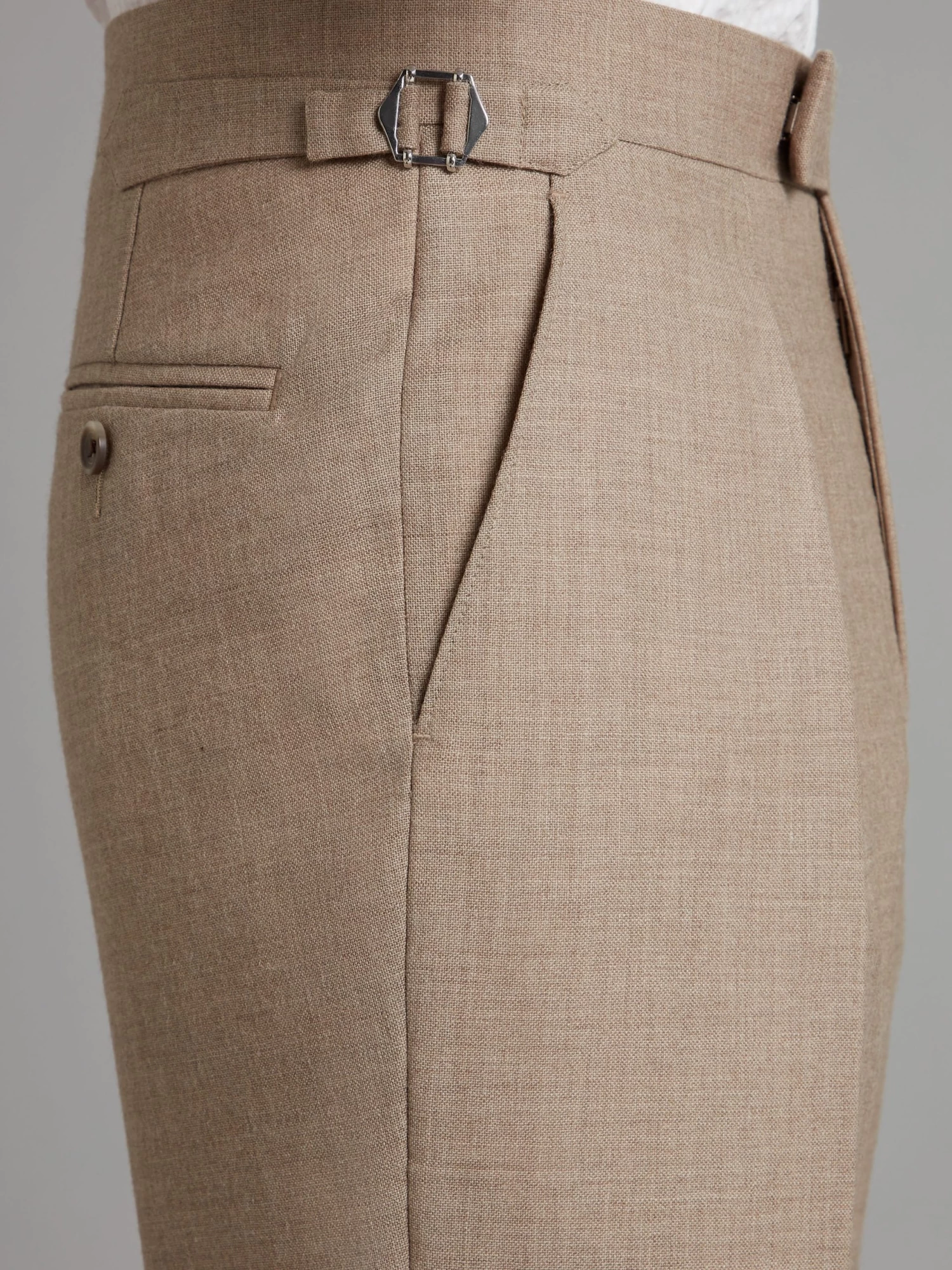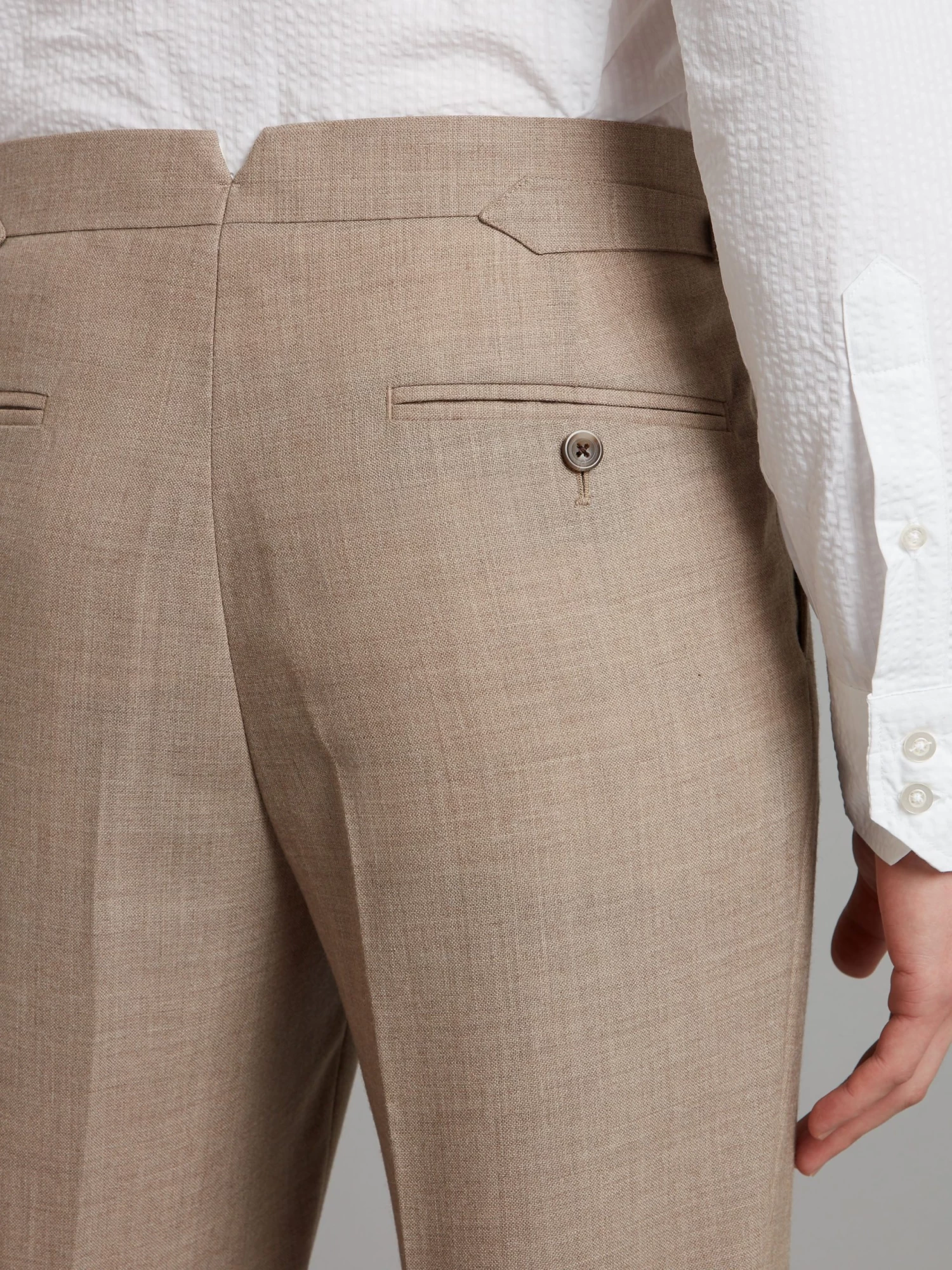 Made from 100% wool from British Cloth Merchants, Dugdale Bros & Co, these light brown trousers are unmatched in comfort and style. This particular cloth is a high performance summer cloth which excels in warmer, humid climates; the high twist wool variation combines merino yarn with superior spinning techniques.