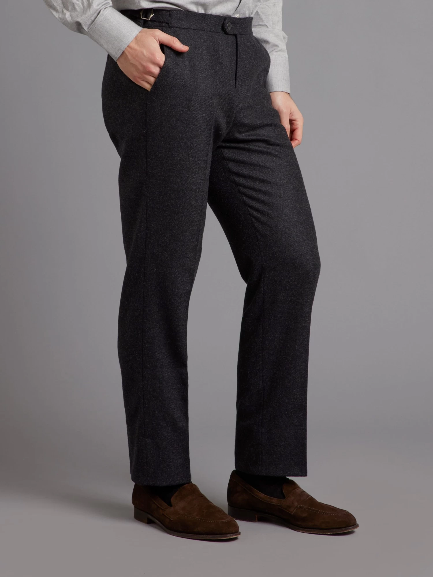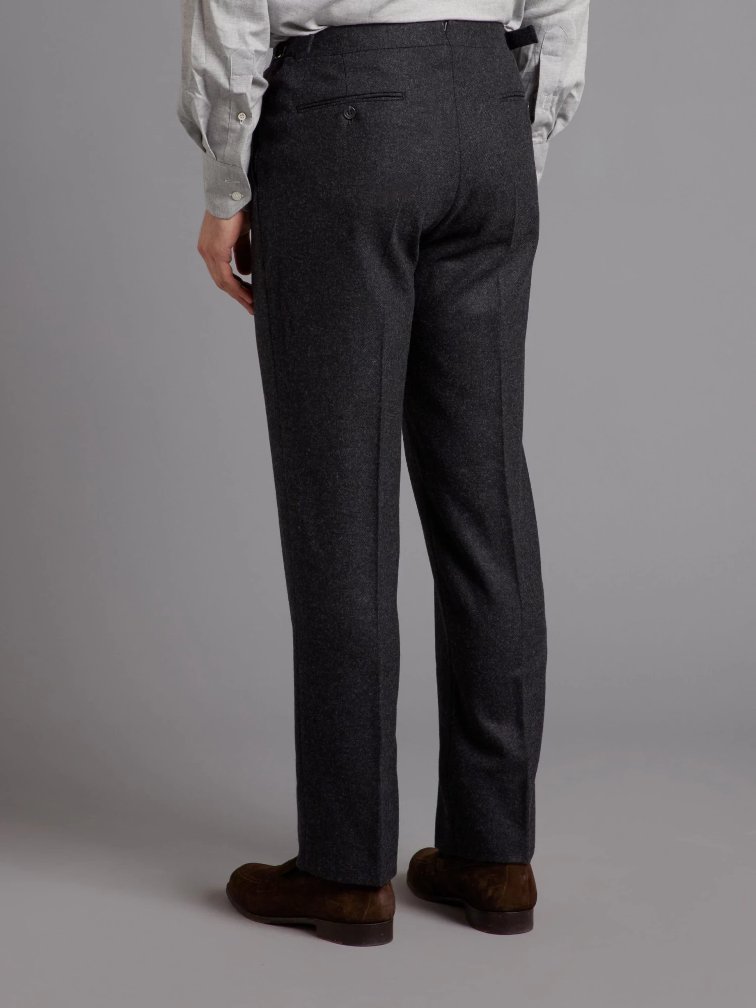 Oliver Brown’s classic wool trousers in a charcoal twill have an exceptionally soft feel, while the complex twill-weave ensures durability. Its heavy weight provides ample warmth for the colder months, and the side adjusters and single pleats provide a custom fit for comfort with out compromising style.