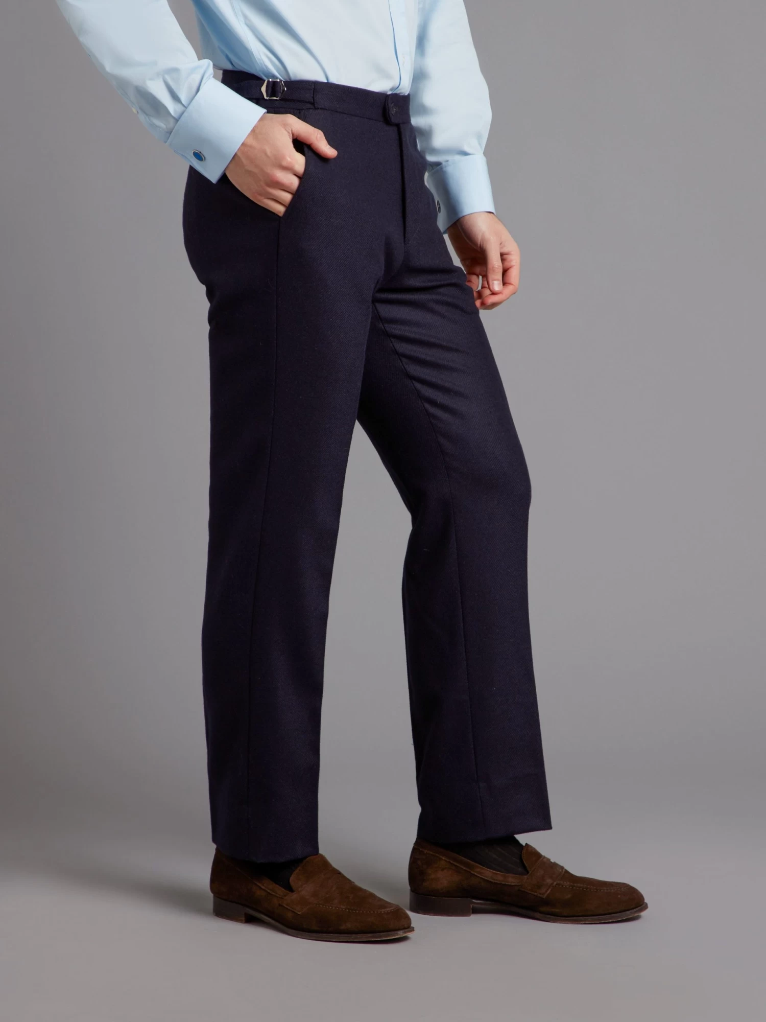 Oliver Brown’s classic wool trousers in a navy twill have an exceptionally soft feel, while the complex twill-weave ensures durability. Its heavy weight provides ample warmth for the colder months, and the side adjusters and single pleats provide a custom fit for comfort with out compromising style.