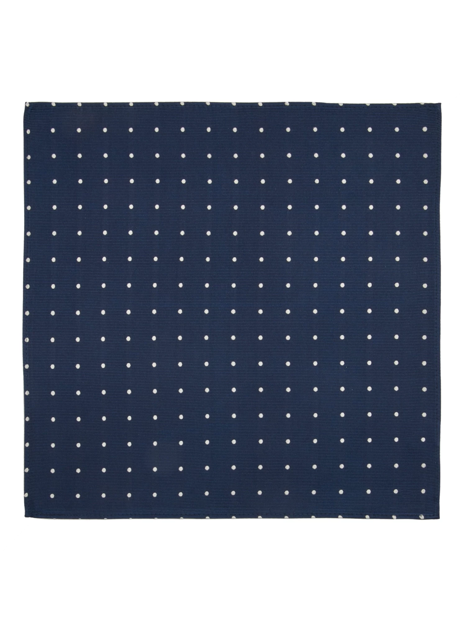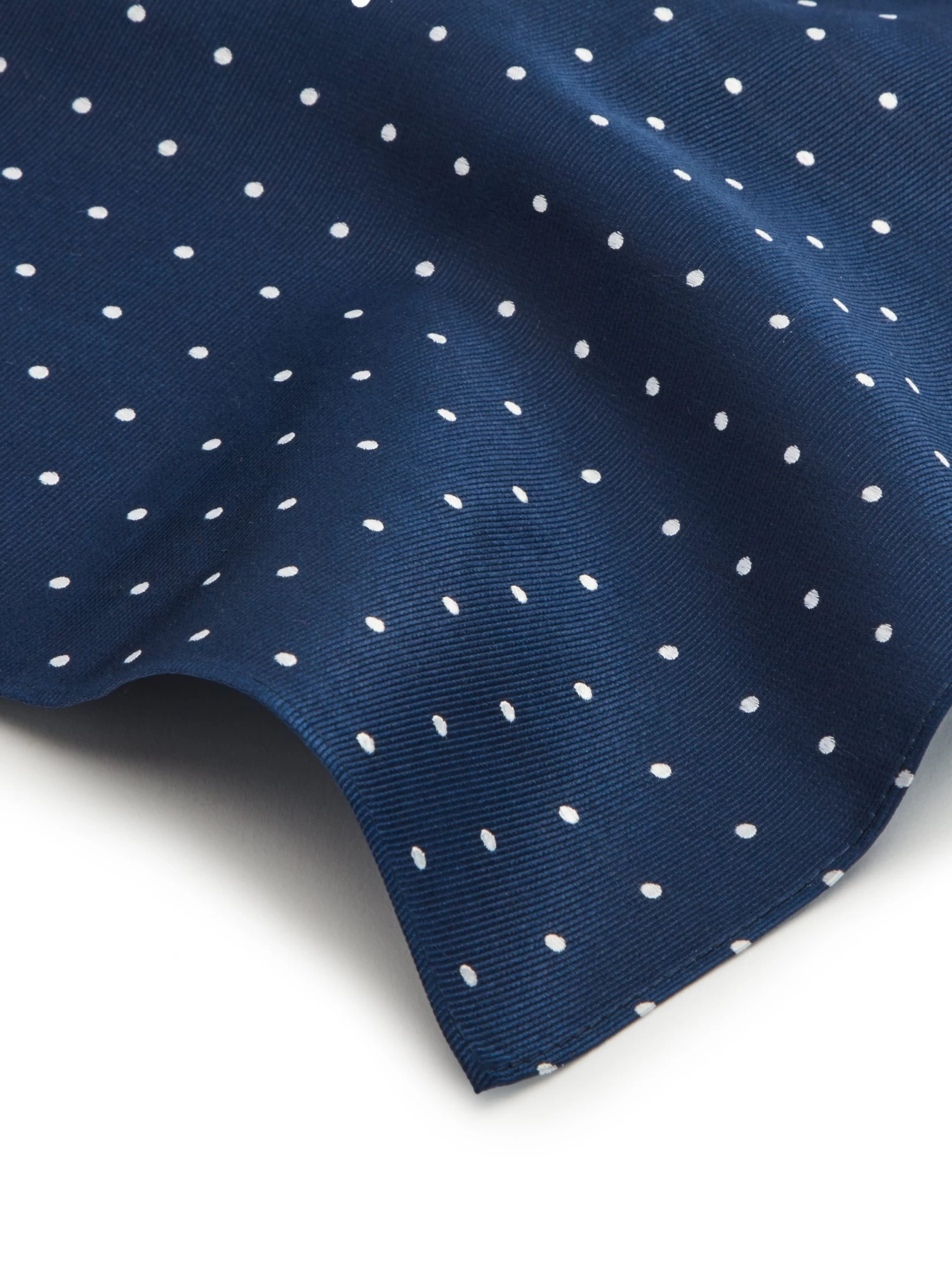 Made in London from a luxurious silk twill, this navy polka-dot pocket square is the ideal finishing touch to a dinner suit or white tie ensemble.
