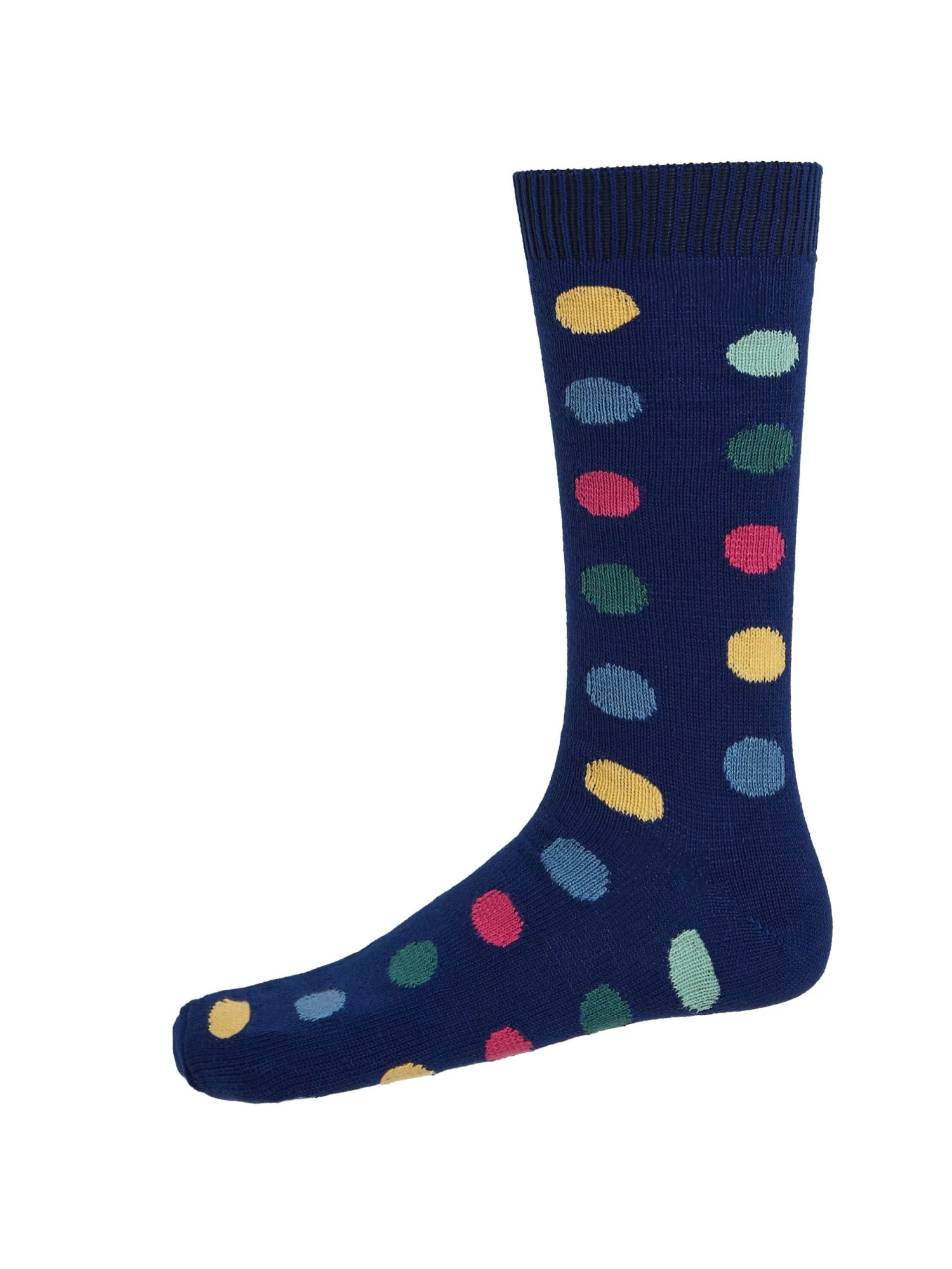 To add a touch of whimsy to your everyday attire, these navy socks with multi-colored polka dots are the ideal choice. Pair them with dress shoes for a playful twist in formal settings or wear them with sneakers to showcase your style in a more casual setting.
