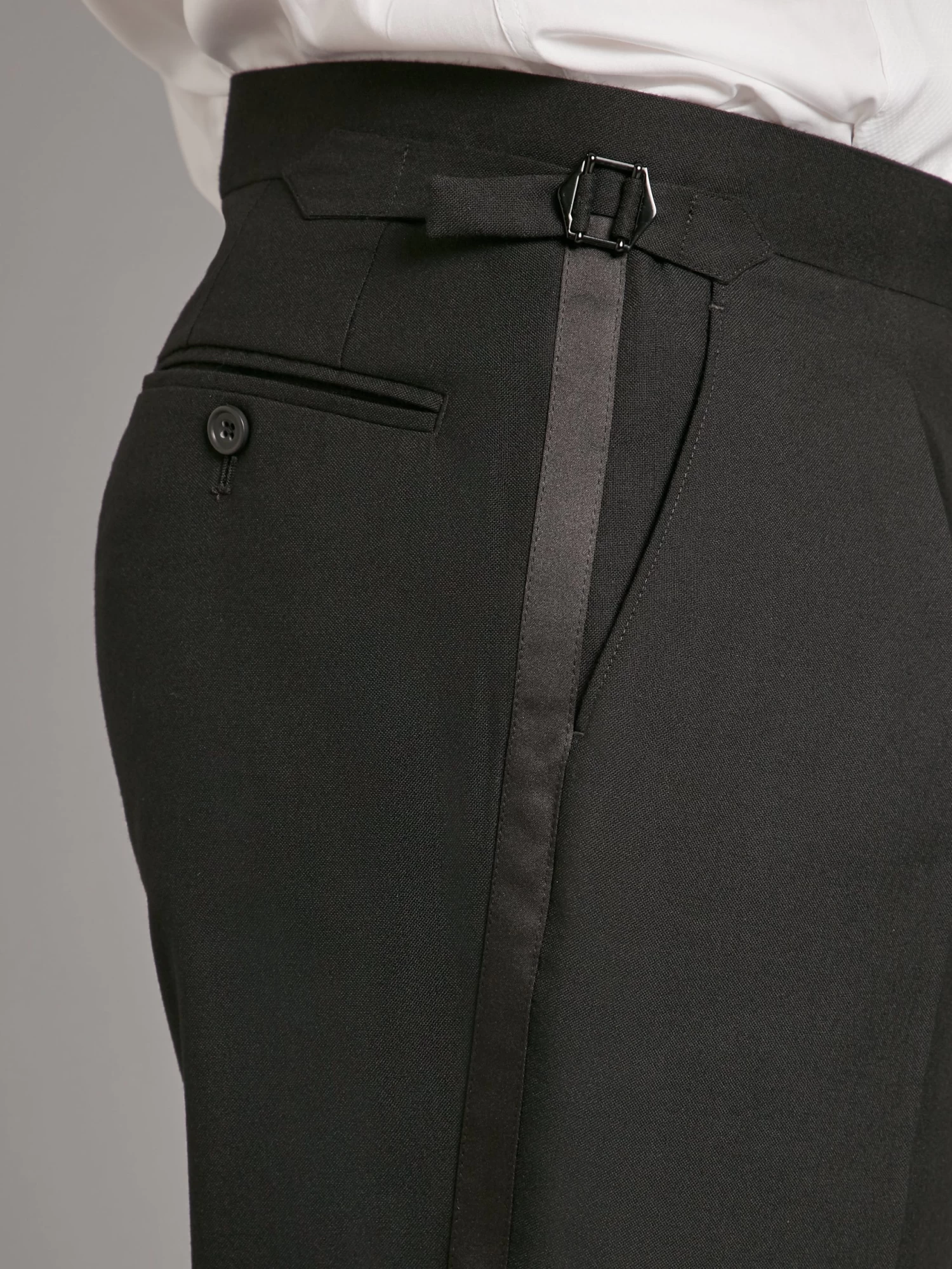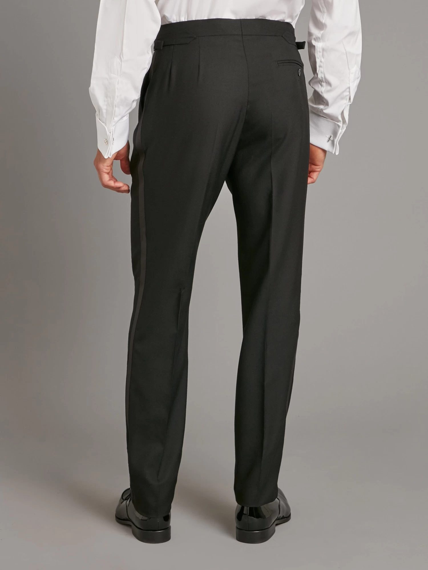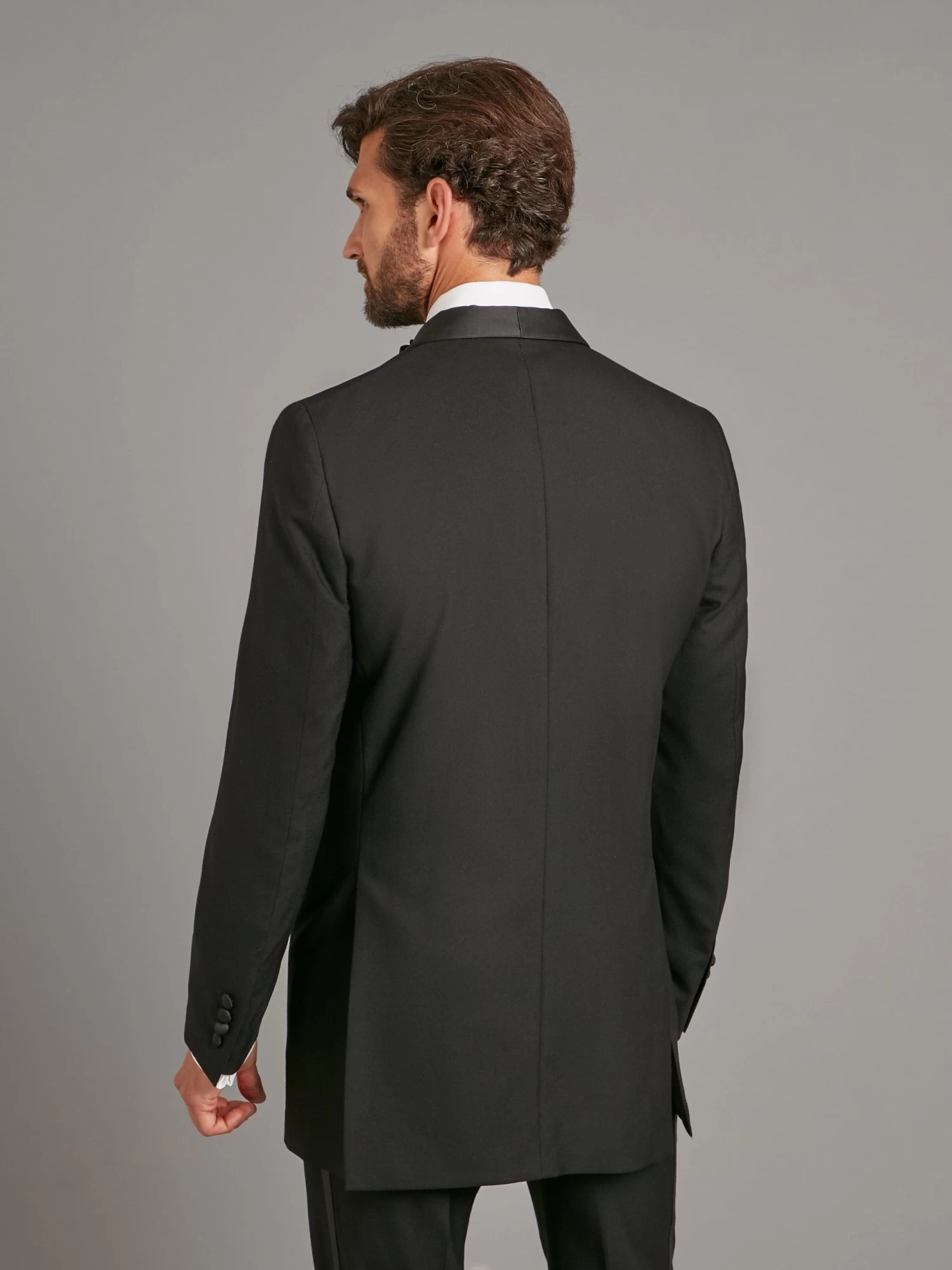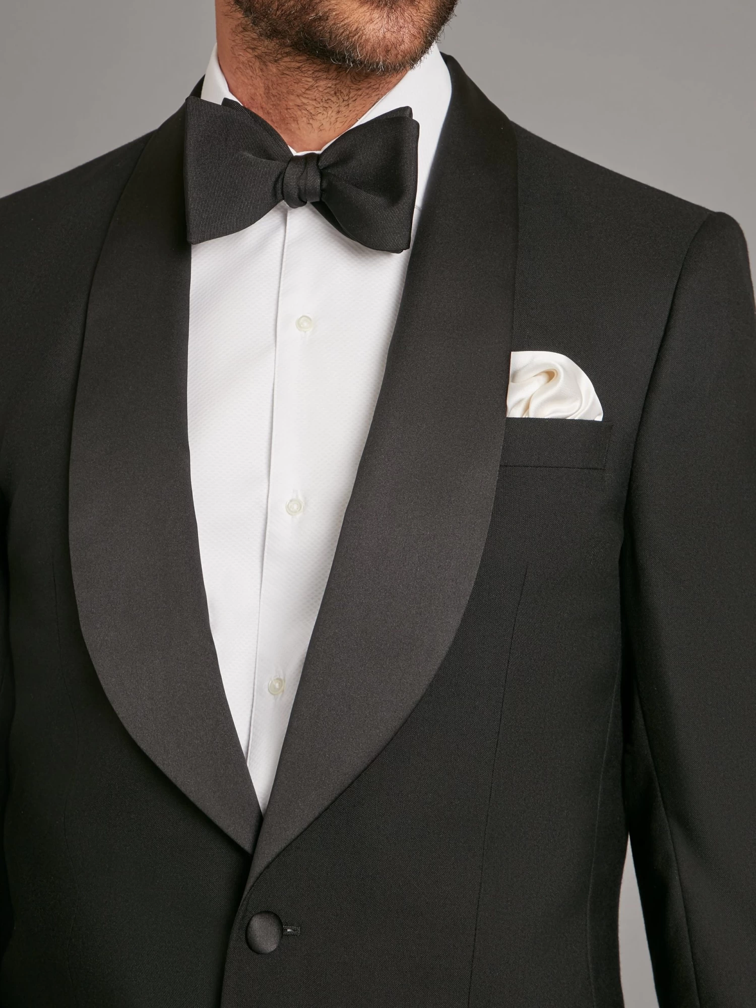 This limited-edition Whittaker Black Dinner Suit in pure cashmere is the ultimate in luxury dinner wear. This exquisitely tailored piece features a plain silk shawl lapel, double welt pockets and a 4 button working cuff. The trousers feature a satin stripe down the side seams of the legs, side adjusters and brace buttons.