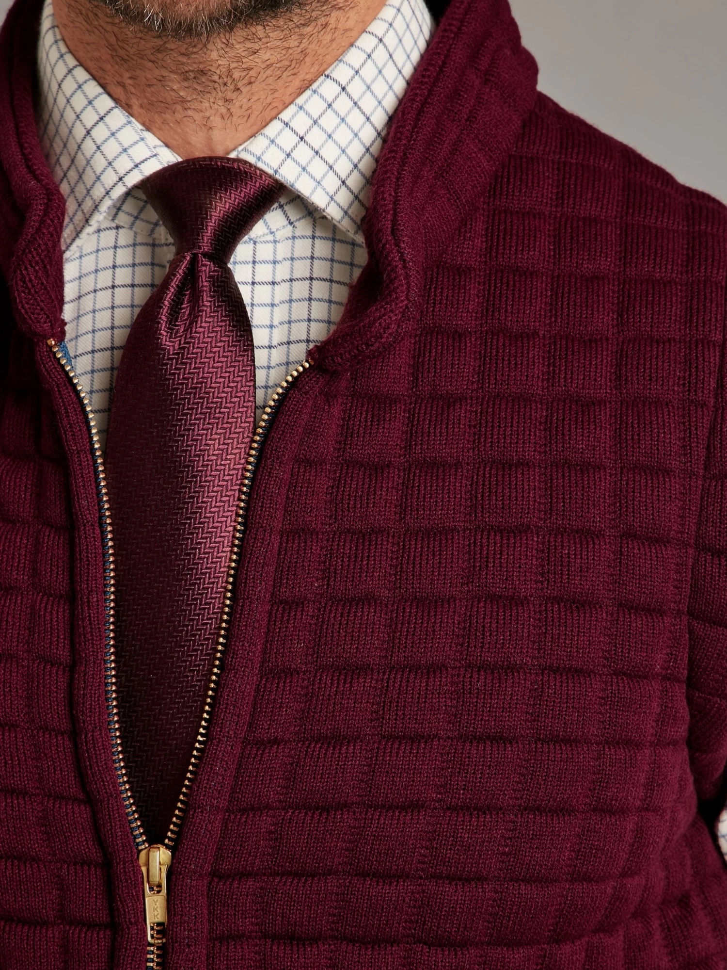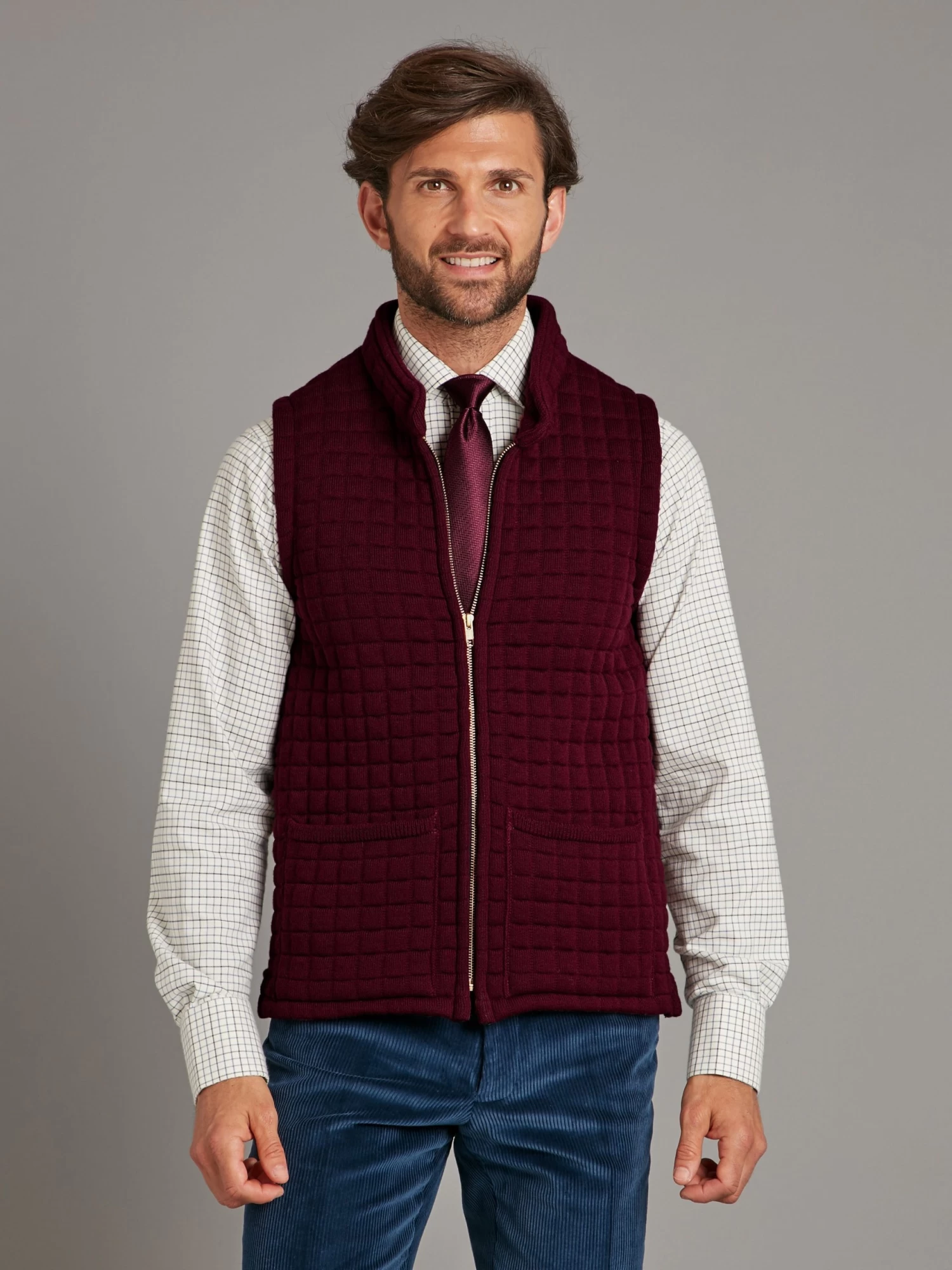 Oliver Brown’s Thermatex Gilet in Burgundy features a heavyweight front zip, patch pockets and a high collar. Designed to help regulate temperature, Thermatex is a warm, yet breathable fabric ideal for all seasons.
