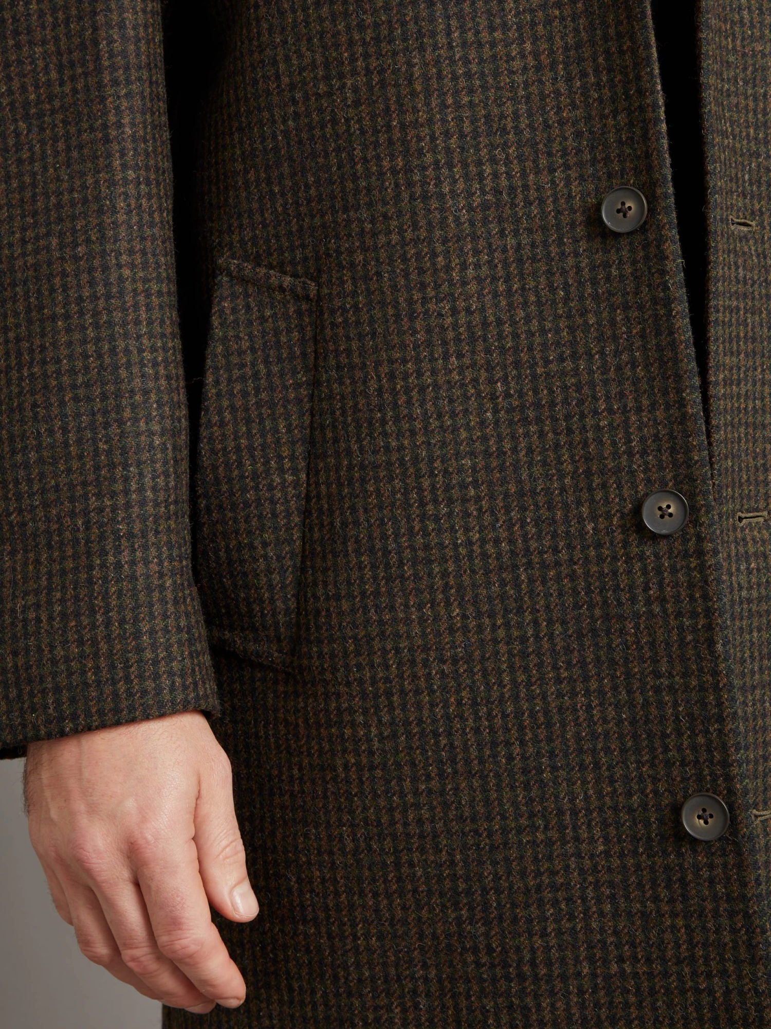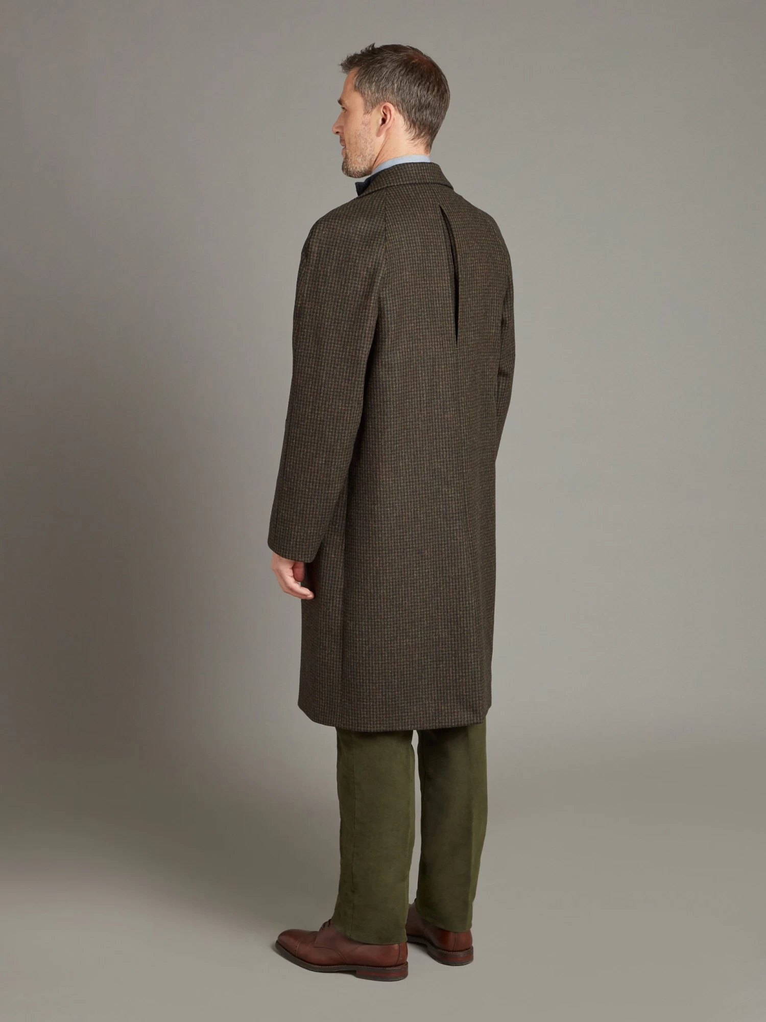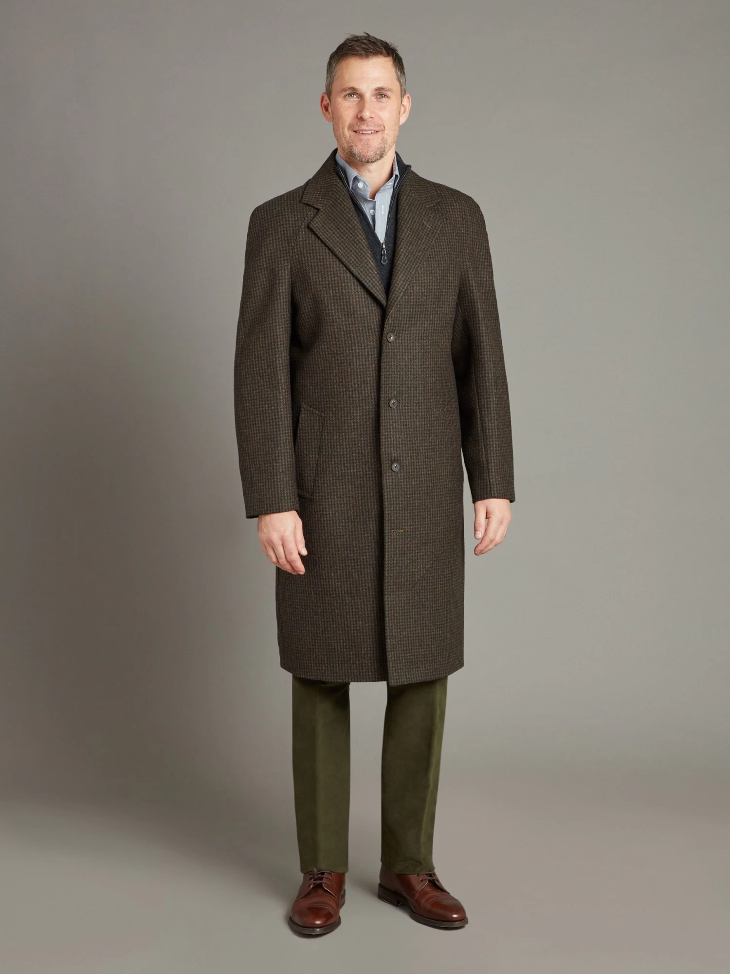 This pure wool single breasted overcoat, in green and brown herringbone, is the perfect addition to your Autumn/Winter wardrobe. The cloth weighs 500gms and has been sourced from renown British Mill, Abraham Moon & Sons, ensuring the highest quality alongside a luxuriously soft hand.