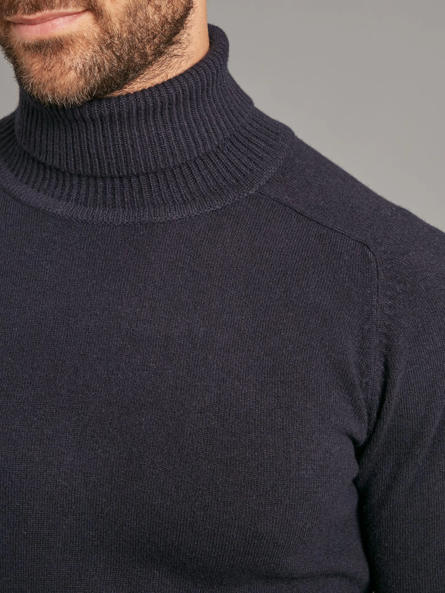 This navy roll neck jumper features the ultra-fine, non-allergenic wool sourced from Merino lambs in Geelong, Australia; it offers unparalleled comfort and warmth while remaining lightweight and breathable. Geelong wool is often compared to cashmere for its luxurious softness and is one of the most sought after lambswool. Layer this classic jumper under a sports jacket and pair with cords for a laid back, sophisticated look.