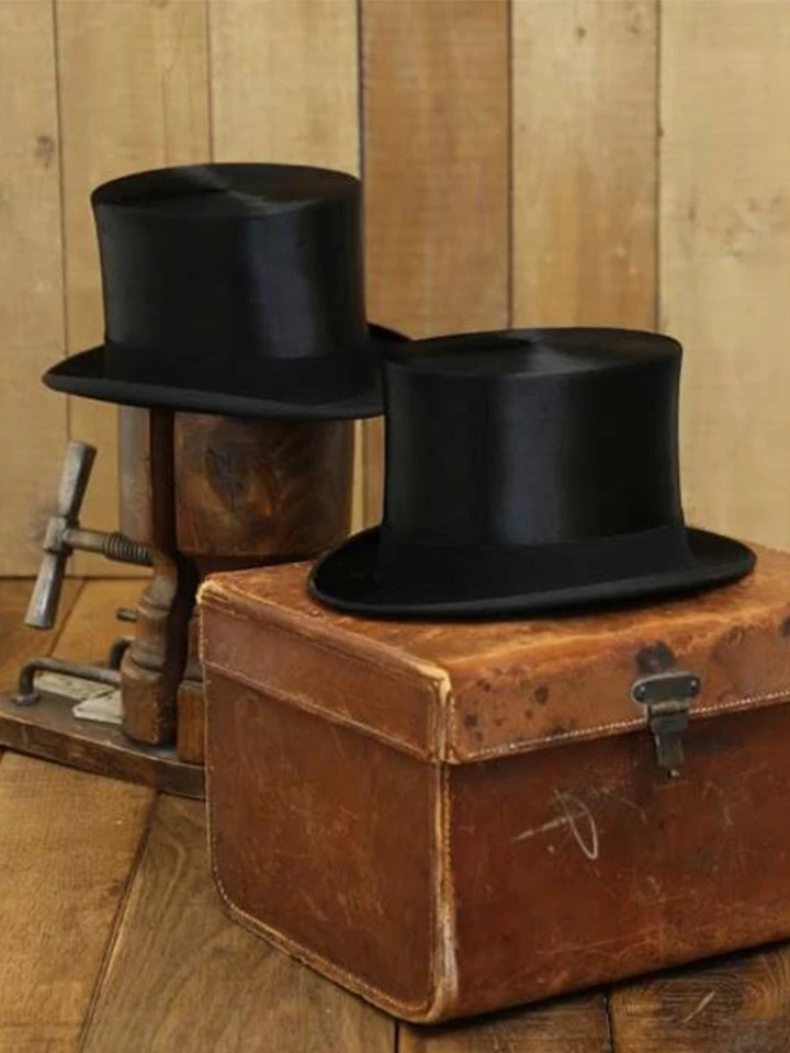 Oliver Brown, the official Royal Ascot Licensee for Top Hats, offers the world’s largest collection of antique silk top hats. Renowned for their exceptional shine, shape, and lightness, these top hats are made from a unique silk plush that is no longer produced.