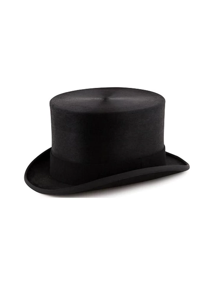 The hat has a beautifully polished finish and a noticeably elegant profile, standing at 5 1/2″ tall. Finished with a grosgrain ribbon band and white satin lining.
