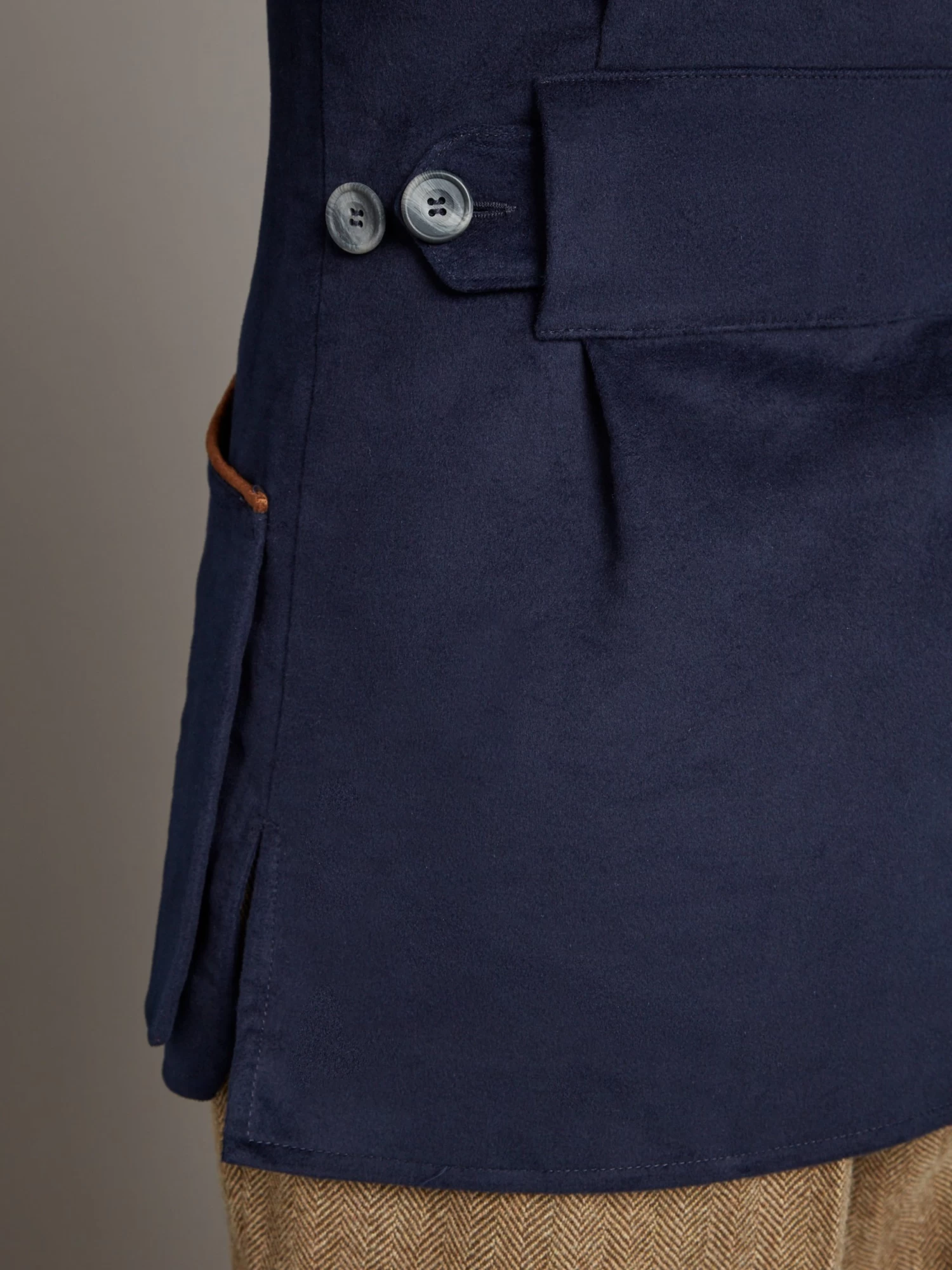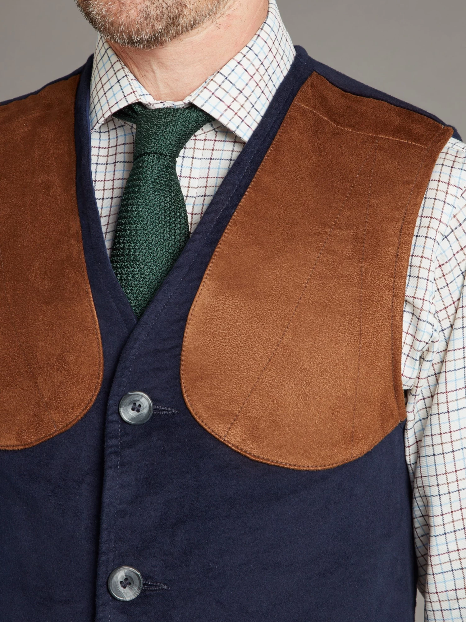 Our navy shooting vest, made from hard-wearing cotton moleskin, feature mock-suede patches for comfort and durability. It is lined in 100% cotton and has a 4-button closure, as well as two internal pockets and generous cartridge pockets. Made from 100% British materials, these vests are manufactured in the North West of England. A great choice for the avid shooter.