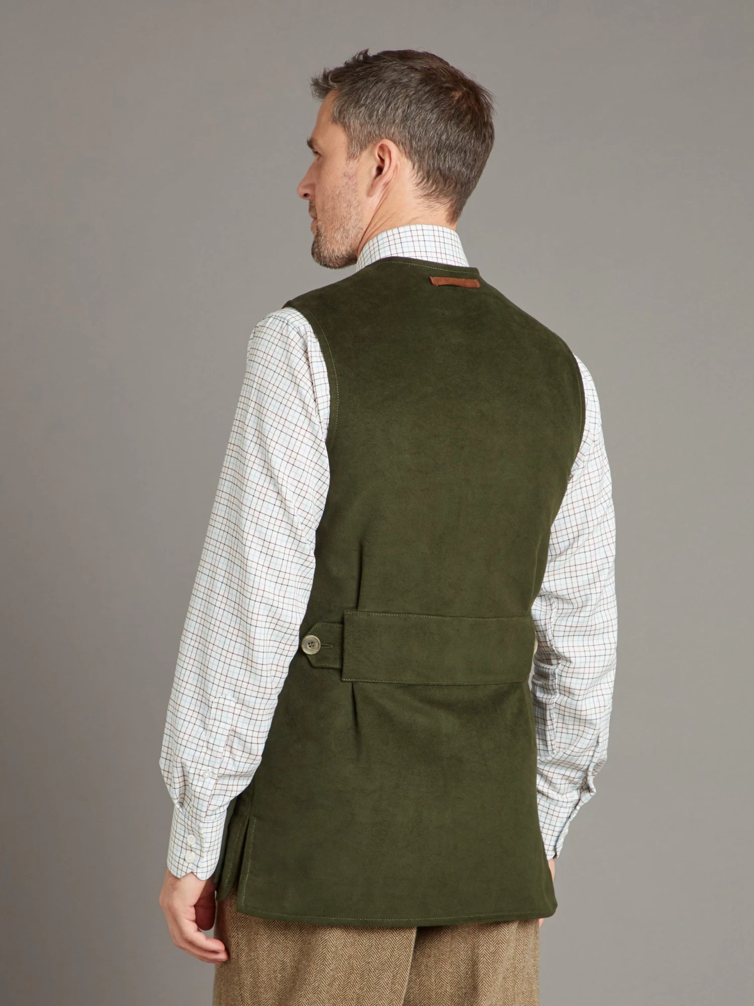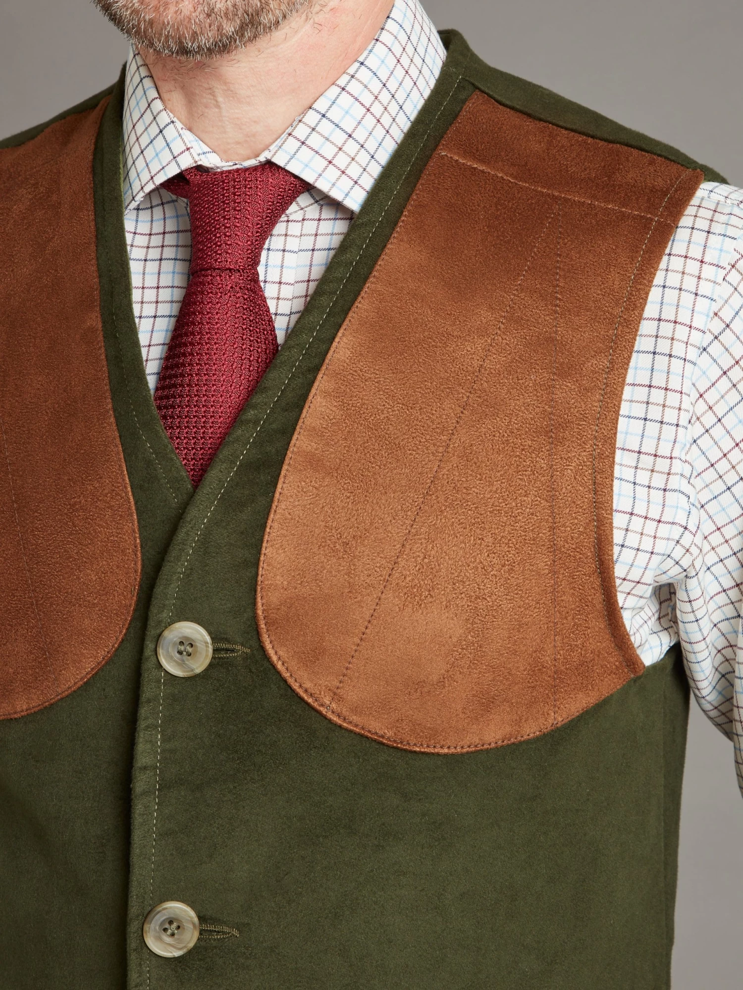Our olive shooting vest, made from hard-wearing cotton moleskin, feature mock-suede patches for comfort and durability. It is lined in 100% cotton and has a 4-button closure, as well as two internal pockets and generous cartridge pockets. Made from 100% British materials, these vests are manufactured in the North West of England. A great choice for the avid shooter.