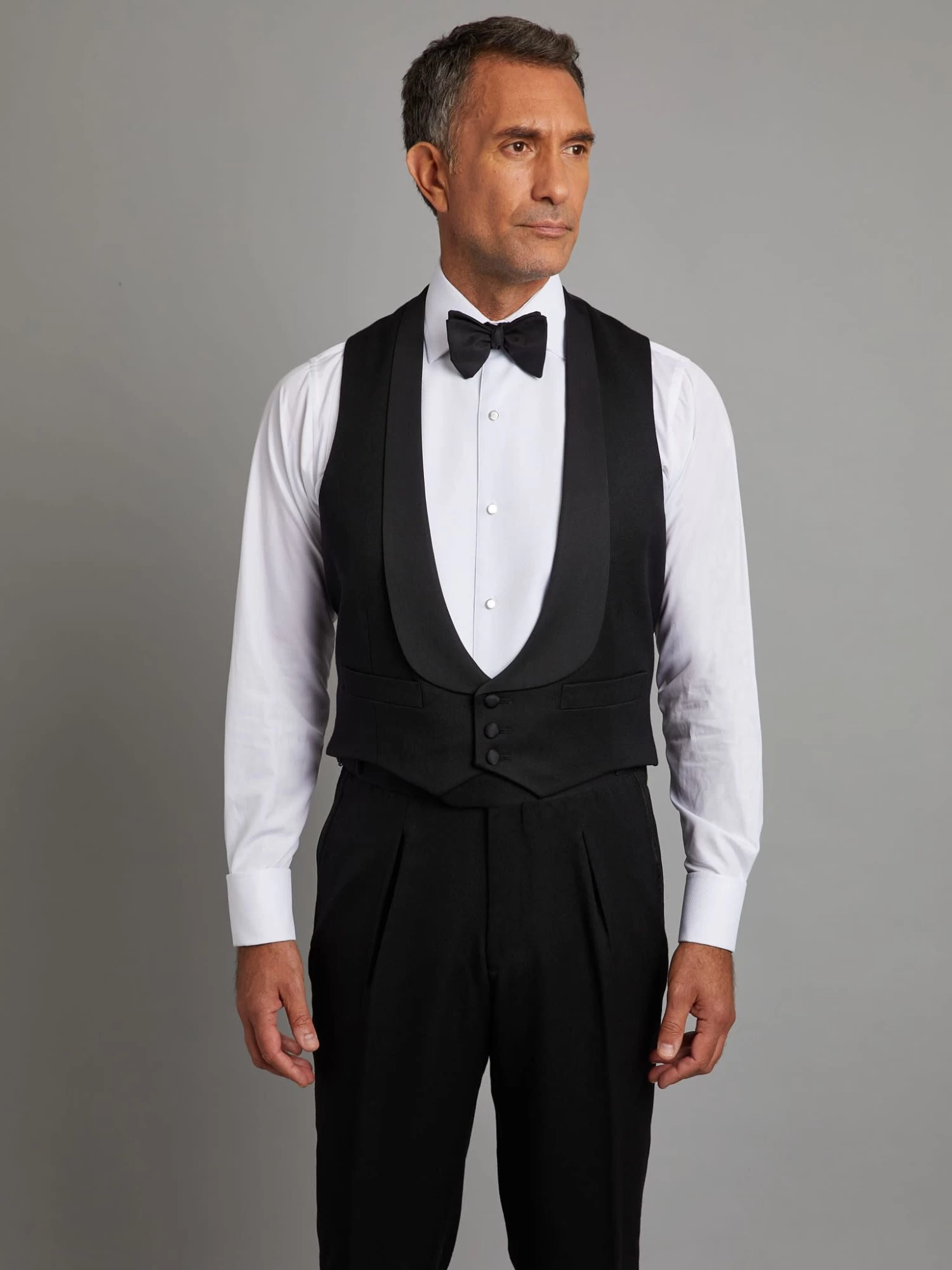 Essential for completing the classic evening wear outfit, these black tie waistcoats are made from barathea wool and feature a shawl collar, corded silk lapels, and silk-covered buttons.