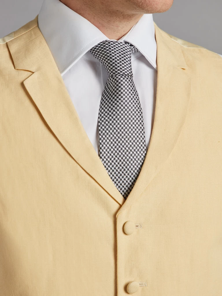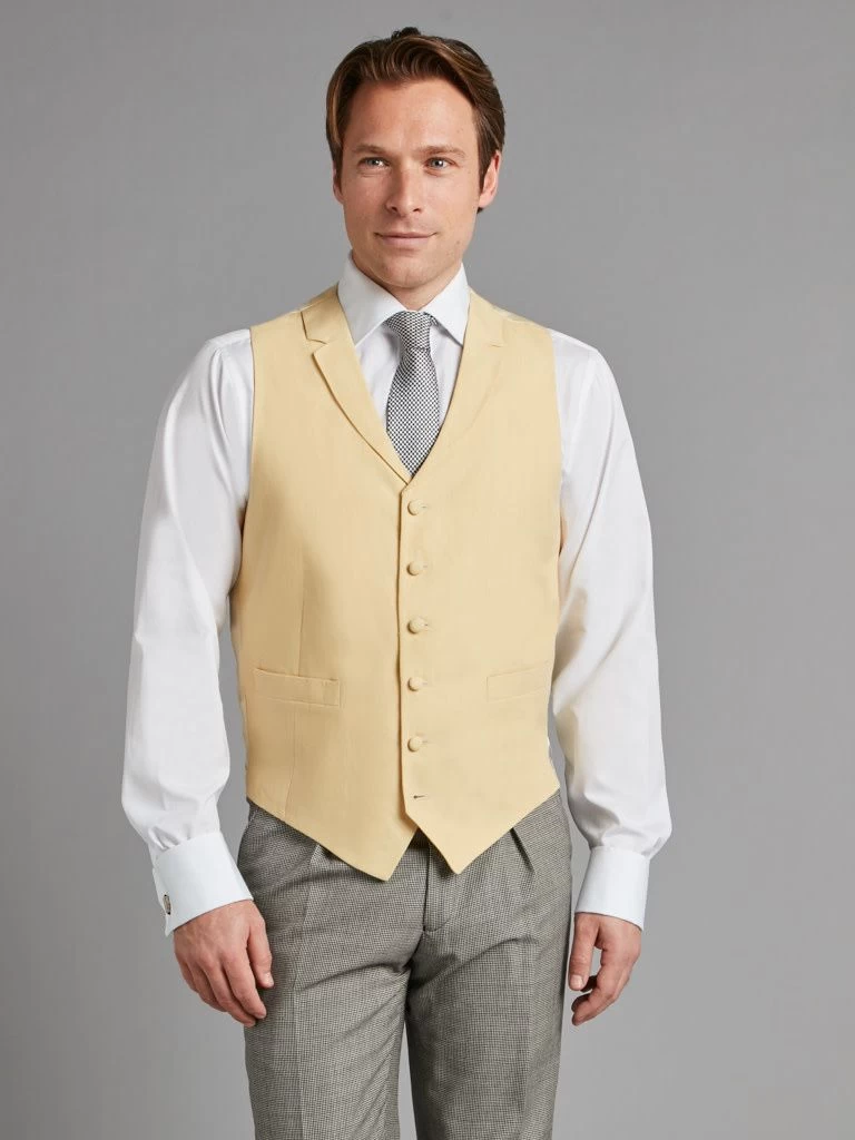 With a classic notch collar, covered buttons, and a satin back panel, this yellow linen waistcoat is a stalwart of morning wear fashion. Crafted from pure Irish linen.
