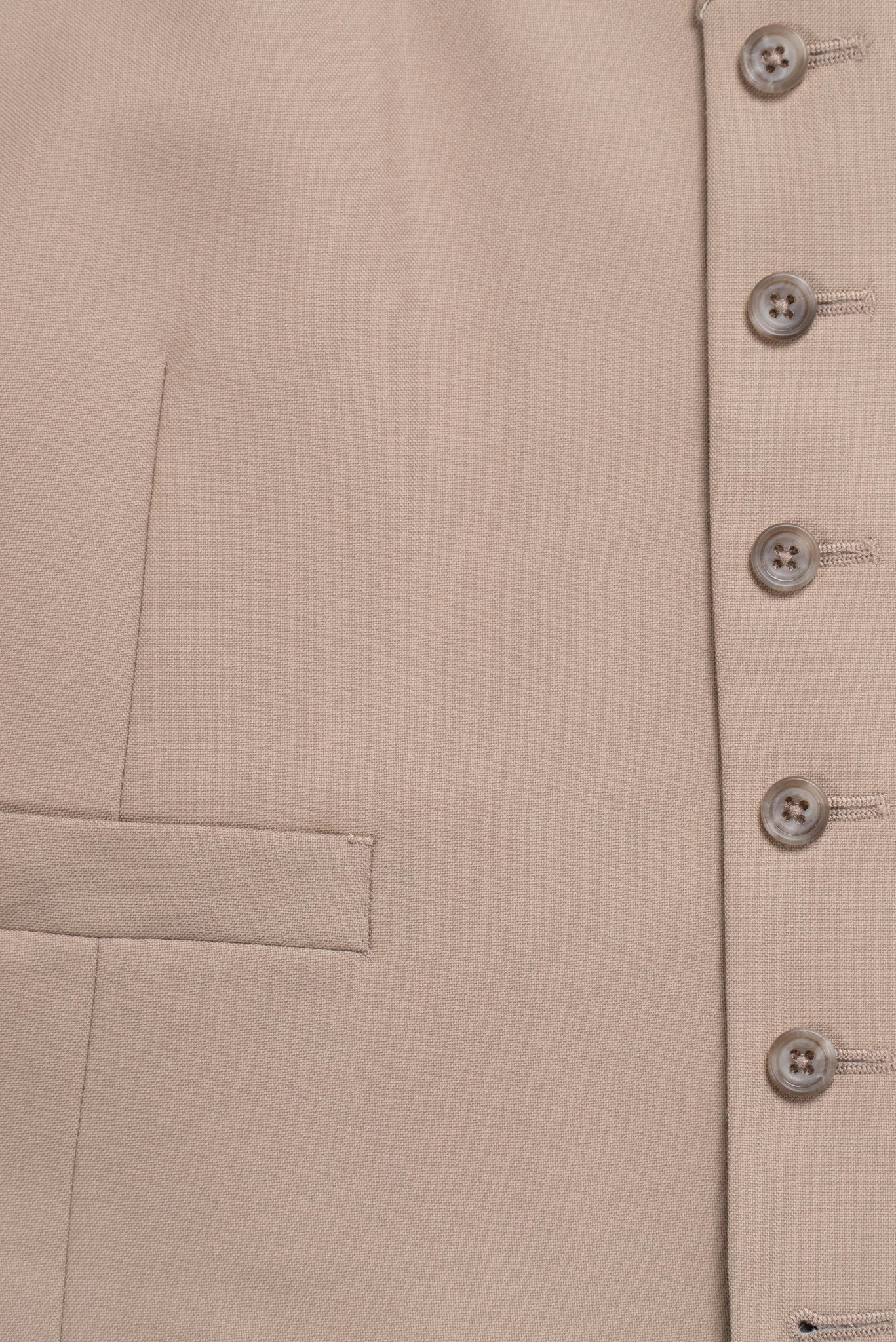 With a classic notch collar, covered buttons, and a satin back panel, our wool waistcoats are a stalwart of morning wear fashion. This buff coloured waistcoat is available in a palette of stylish muted shades, all crafted from pure British wool.