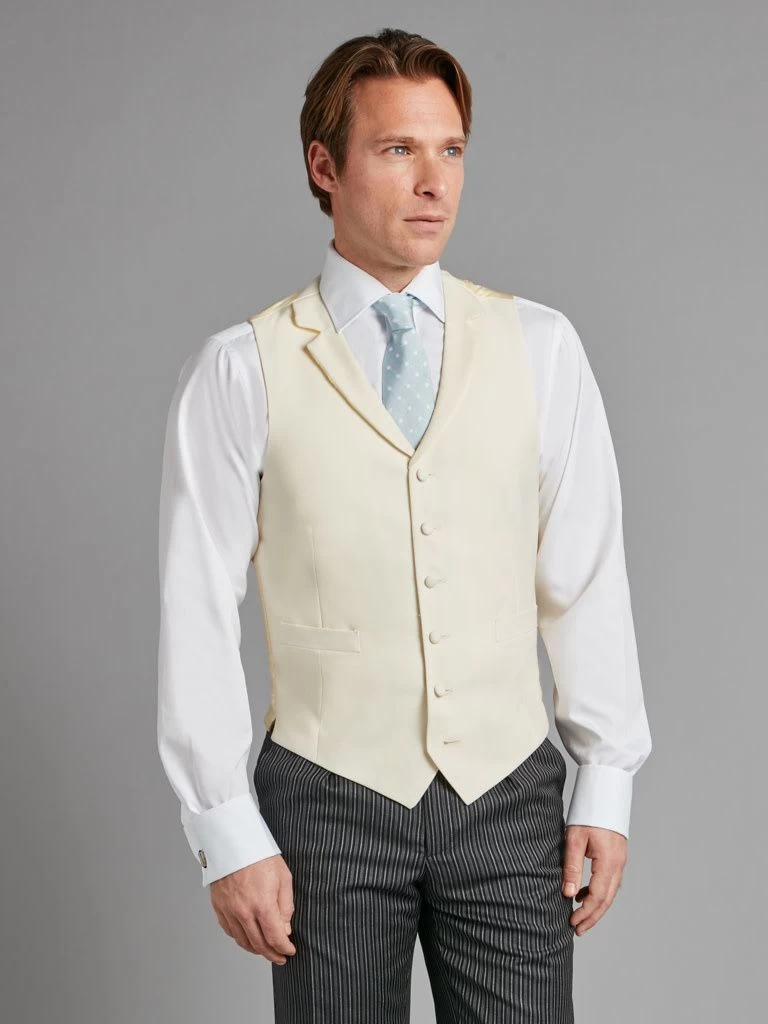 With a classic notch collar, covered buttons, and a satin back panel, our wool waistcoats are a stalwart of morning wear fashion. This waistcoat is available in a palette of stylish muted shades, all crafted from pure British wool.