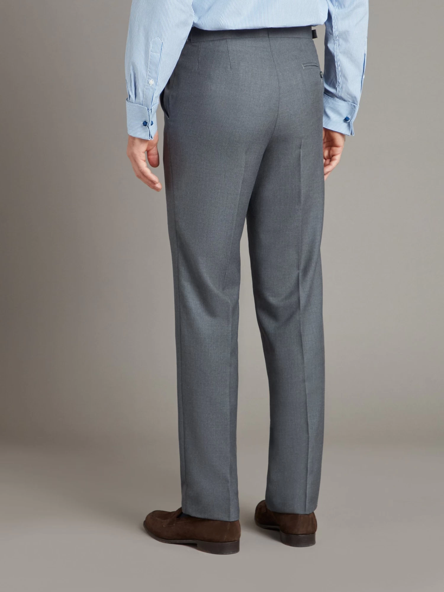 This grey suit is cut from 100% wool. It features a pick-and-pick double jetted flap pockets, and a four-button working cuff.