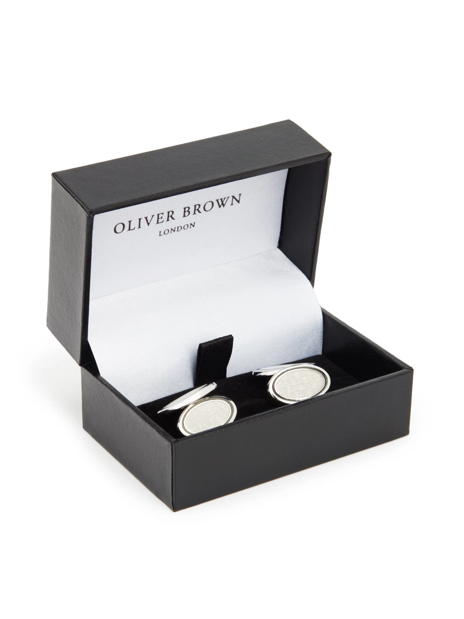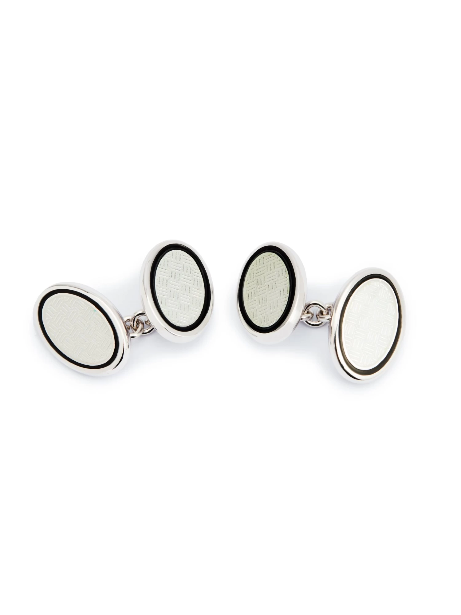 Sterling silver cufflinks featuring a chain link and striking white design.