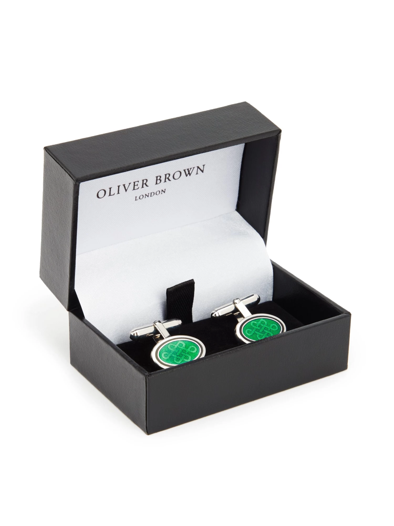 Sterling silver cufflinks featuring a vibrant green Celtic design.