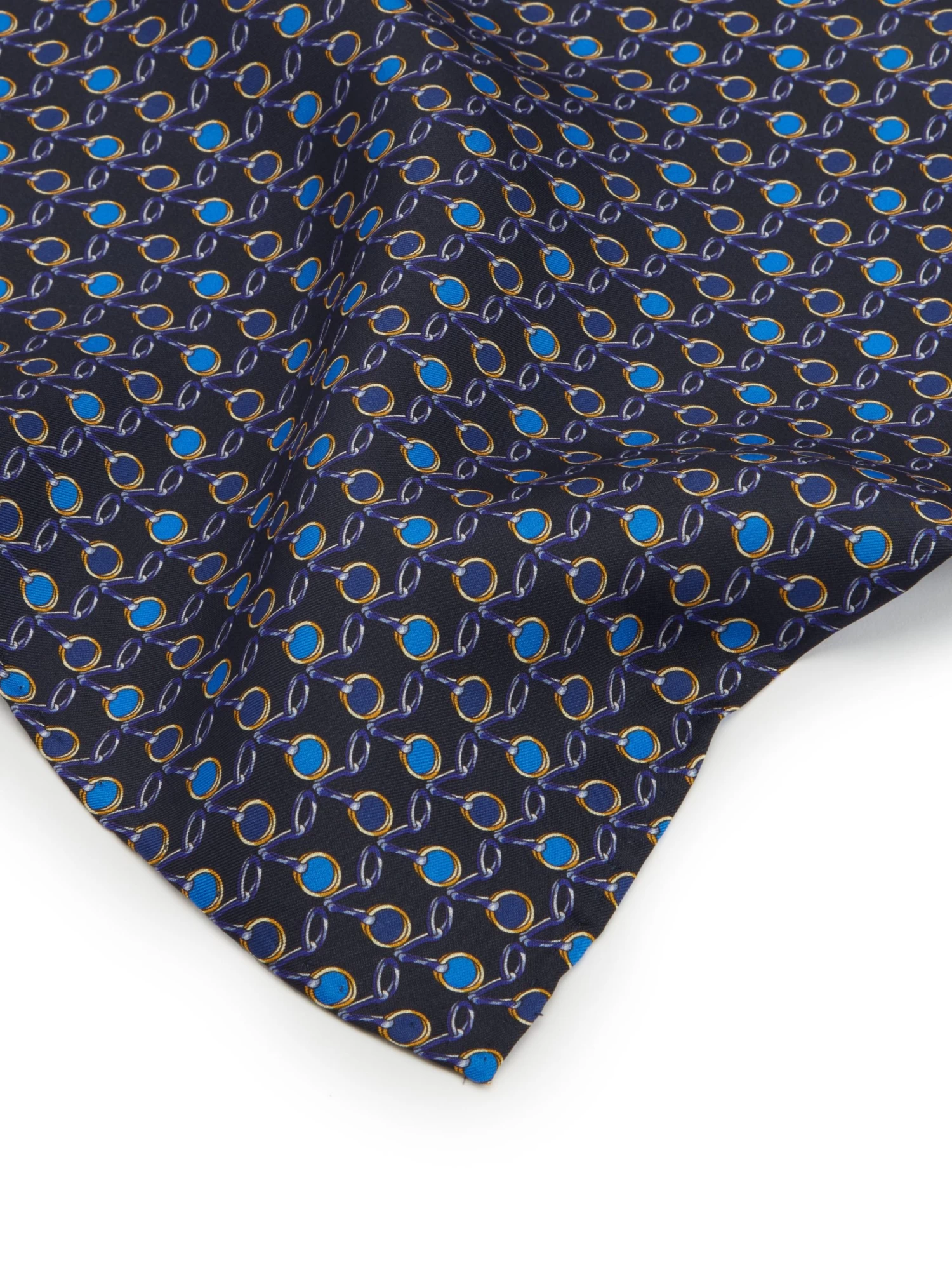 Add some flair to your look with this 100% silk blue handkerchief featuring a stirrup motif. Made with the highest craftsmanship and attention to detail, it’s the perfect accessory for any formal or special occasion, guaranteed to add a touch of elegance and personality to your outfit.