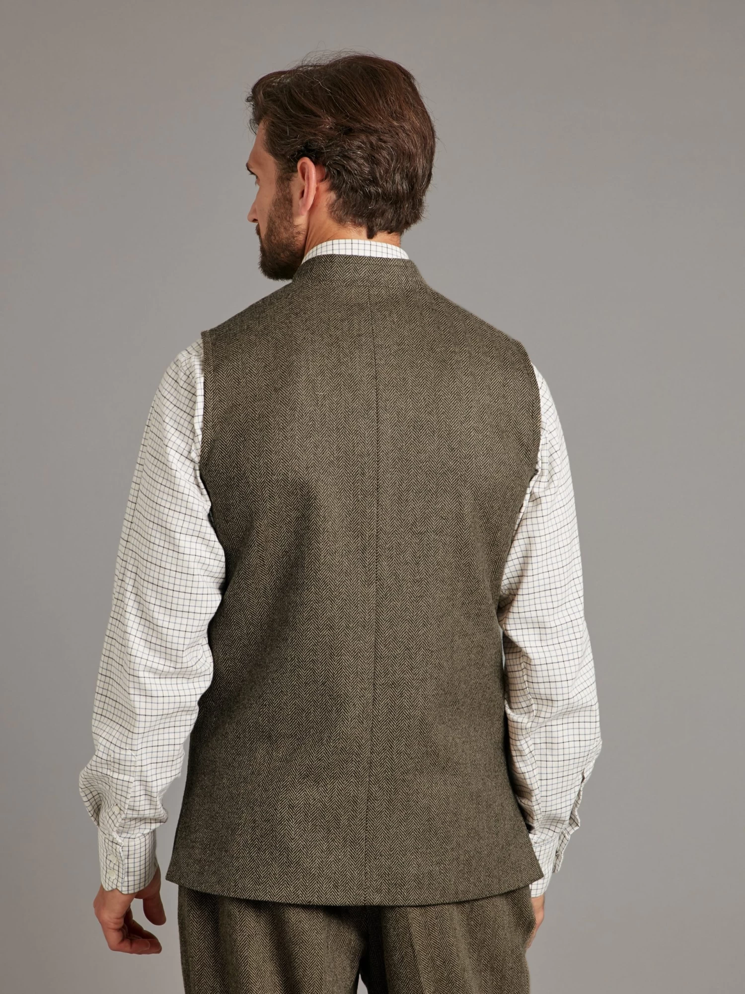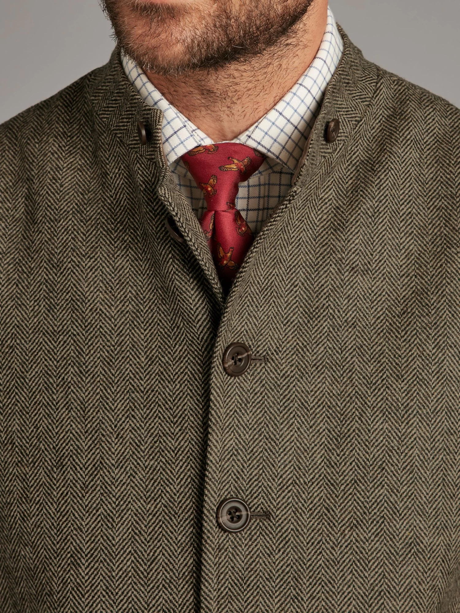 Our Storm Collar Gilet in Deveron Tweed has a green and herringbone pattern. The gilet features a storm collar lined with soft suede for comfort; box pleat pockets with flaps that can be buttoned back for easy access; and side vents for ease in mobility. Whether stalking through heather or strolling through a park in town, tweed Eaton Jacket is sure to impress.