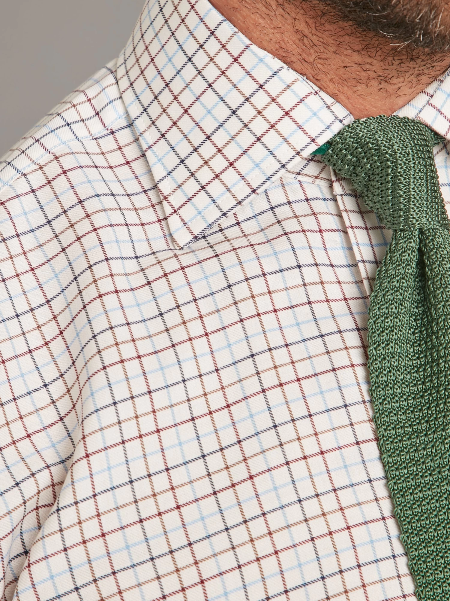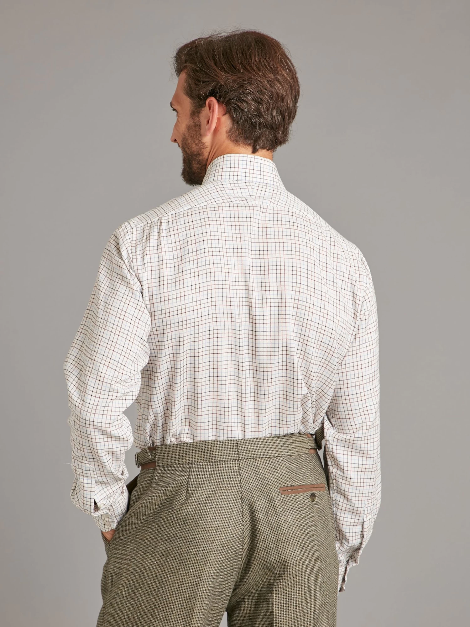 Our Tattersall Check Shirt in burgundy and pale blue features the timeless design of alternate vertical and horizontal stripes in a square-within-square pattern, that is woven into the cloth. This classic design is still connected to the country and originated from the 1700s Tattersall Market Horse Blankets; it is an iconic look most often seen on classic shirts and waistcoats.
