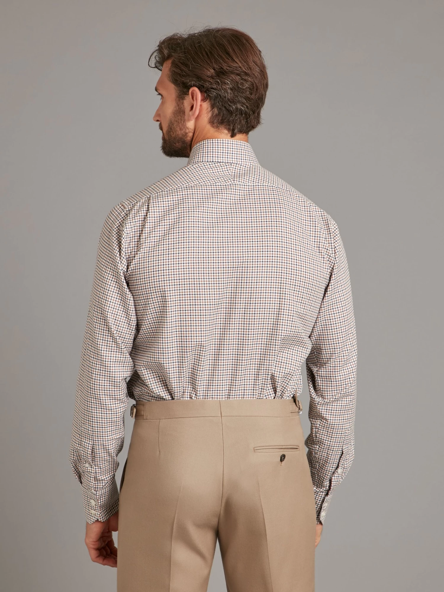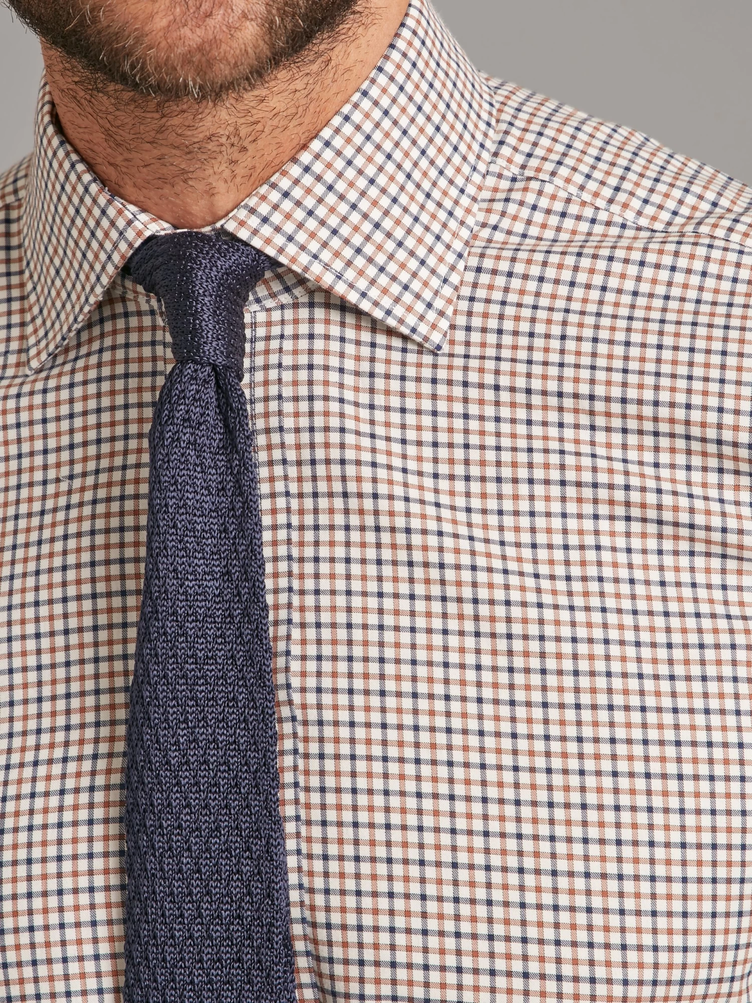 Our Tattersall Check Shirt in caramel brown and navy features the timeless design of alternate vertical and horizontal stripes in a square-within-square pattern, that is woven into the cloth. This classic design is still connected to the country and originated from the 1700s Tattersall Market Horse Blankets; it is an iconic look most often seen on classic shirts and waistcoats.
