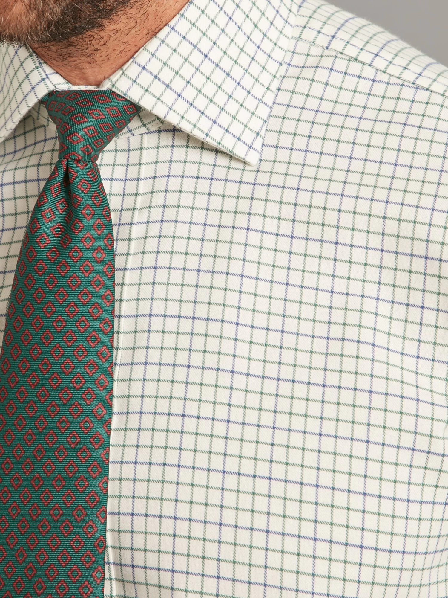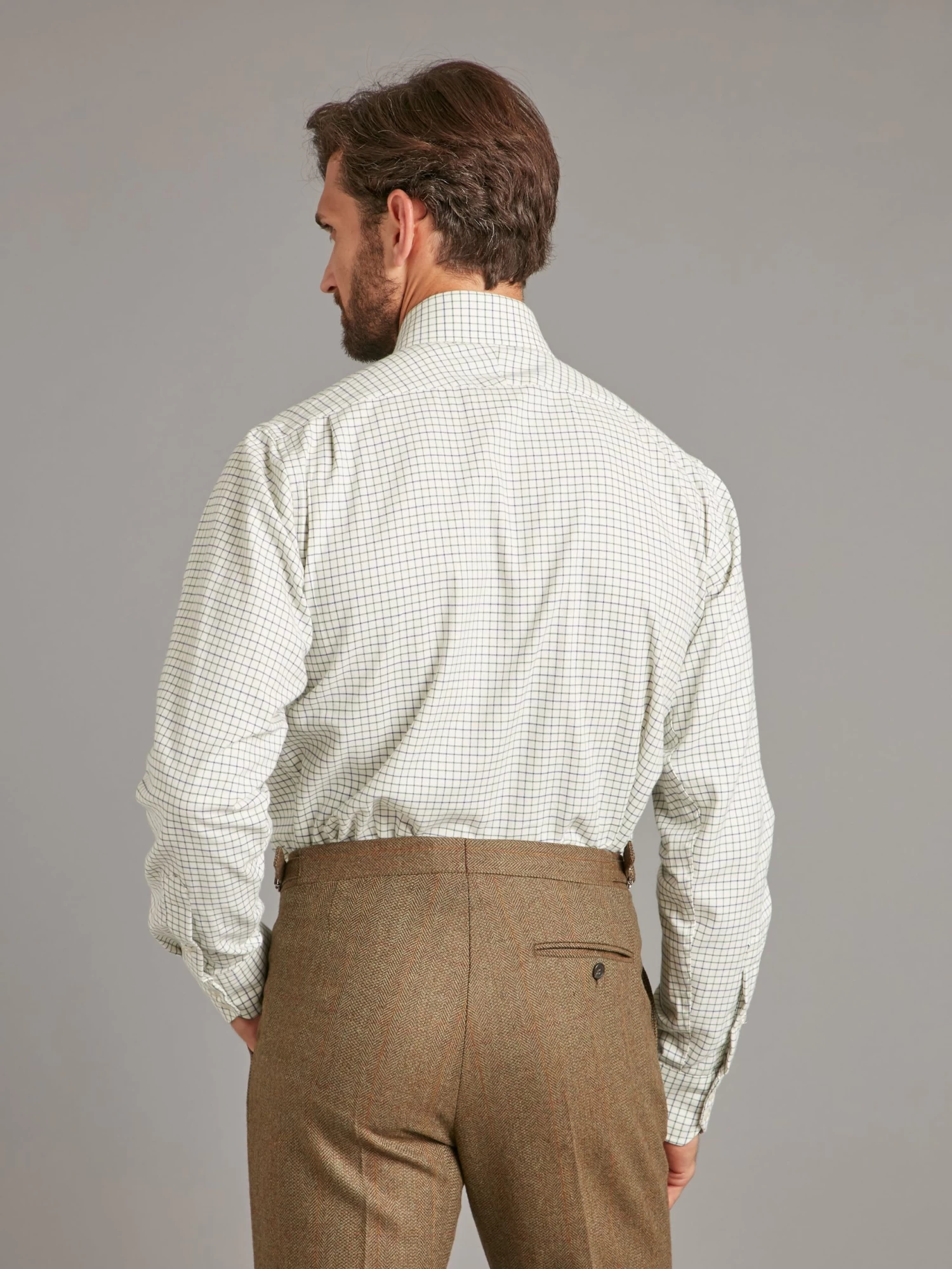 Our Tattersall Check Shirt in Green and Navy features the timeless design of alternate vertical and horizontal stripes in a square-within-square pattern, that is woven into the cloth. This classic design is still connected to the country and originated from the 1700s Tattersall Market Horse Blankets; it is an iconic look most often seen on classic shirts and waistcoats.