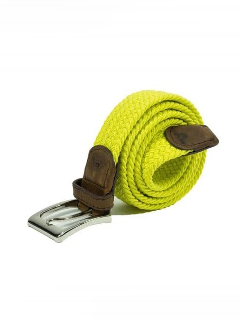 This is a high quality cotton covered woven fabric belt with dark brown leather trimmings and an anti-tarnish bright silver finish metal buckle. The buckle prong simply goes through the belt material to give the perfect fit for the wearer.