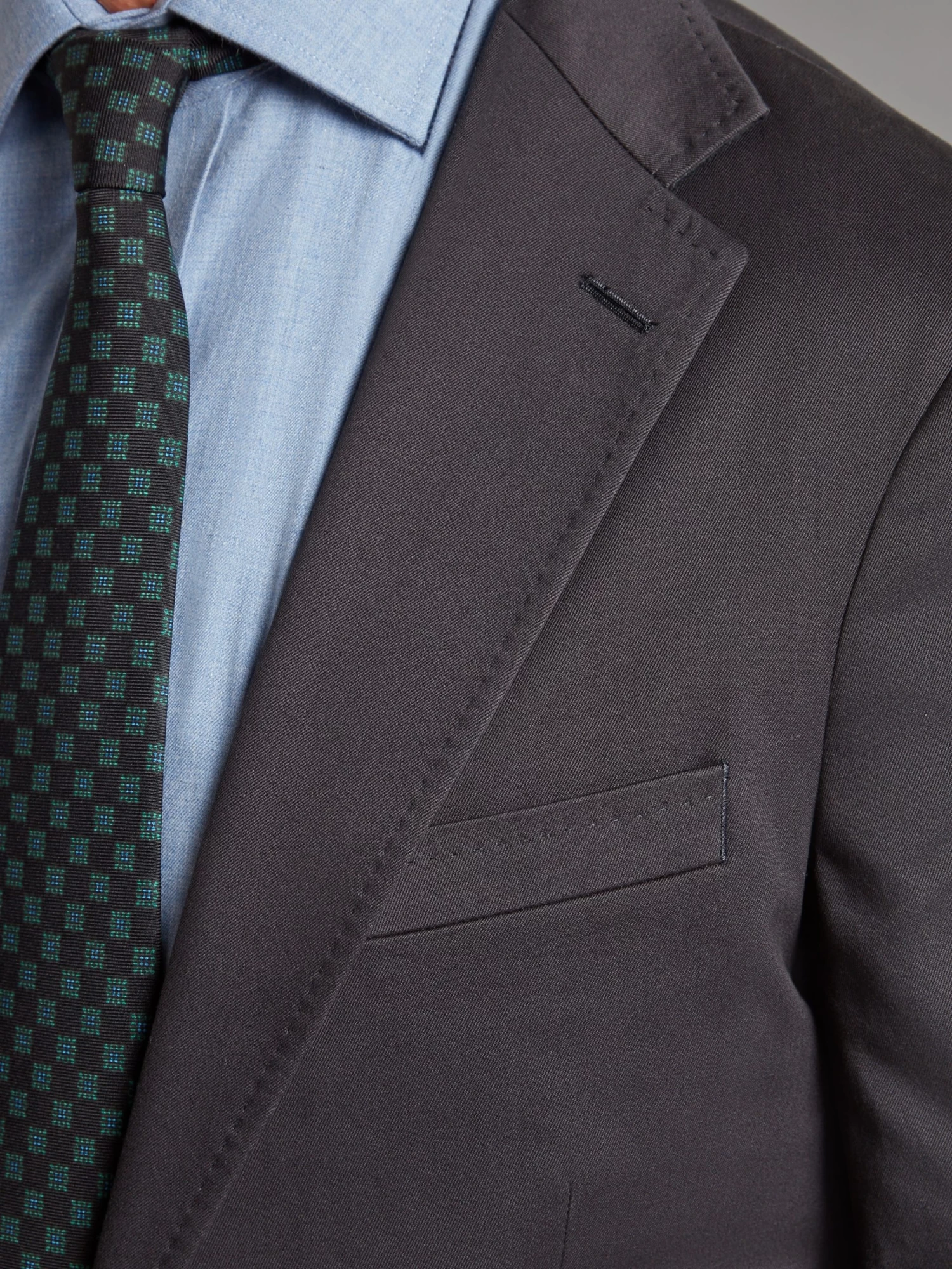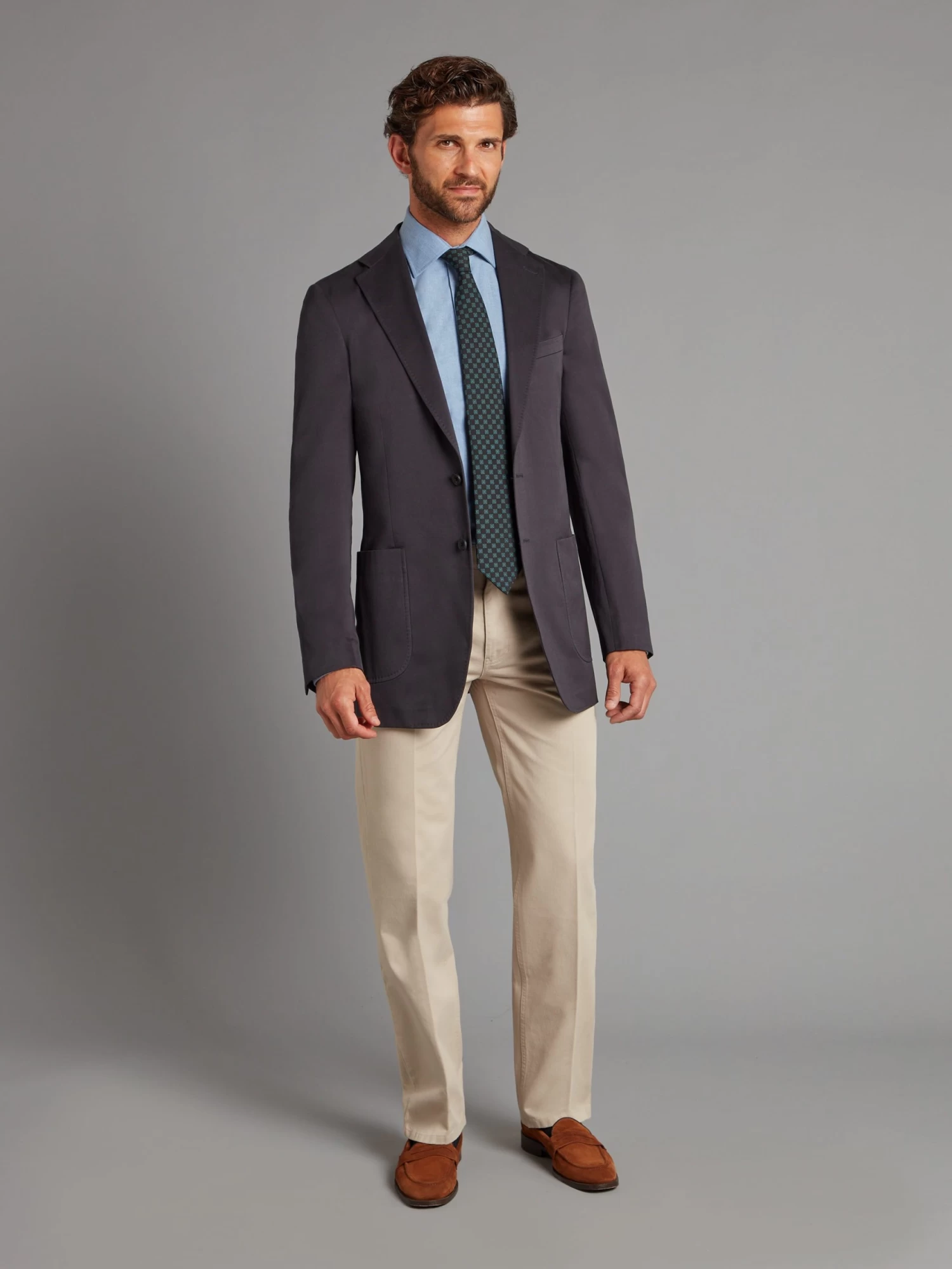 Our unstructured navy jacket, is crafted from 100% cotton sets itself apart with its unlined design, offering not only a relaxed and casual aesthetic, but also a garment that molds to your natural body shape. The interior and exterior are meticulously finished, showcasing attention to detail; it features patch pockets, double vents and four-button working cuffs.