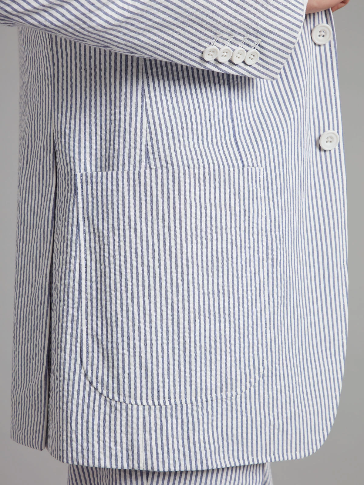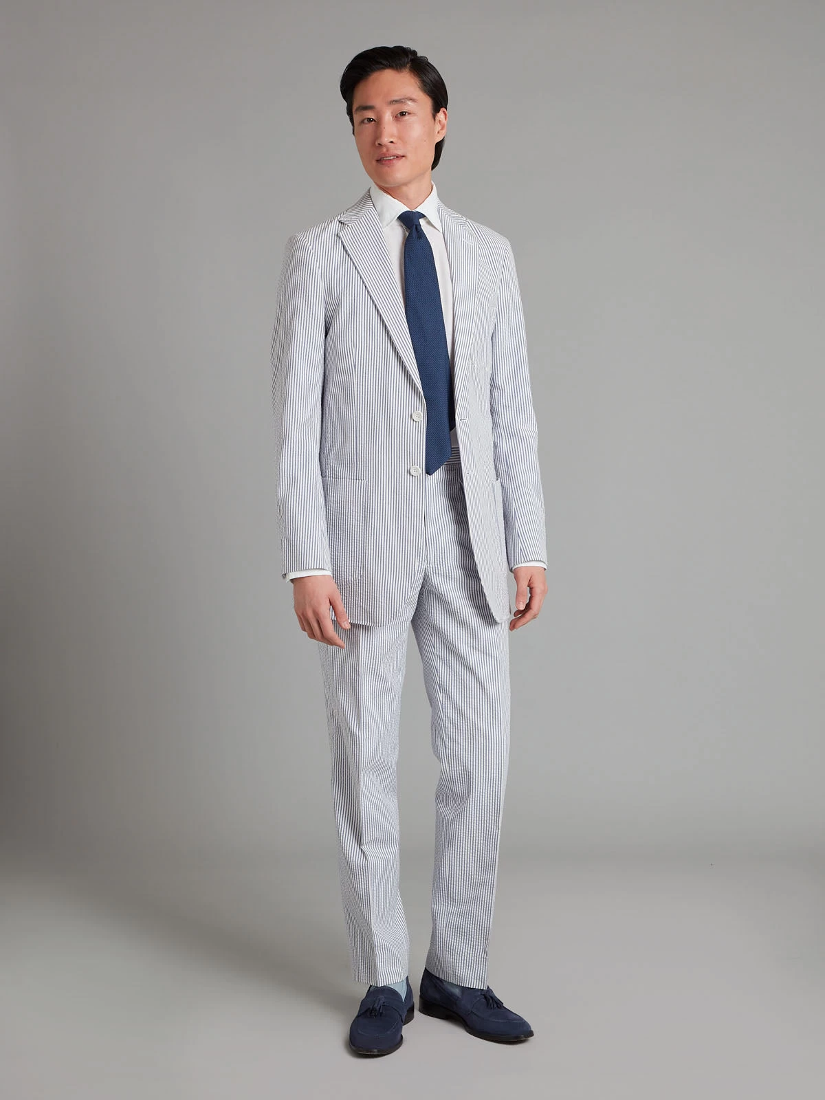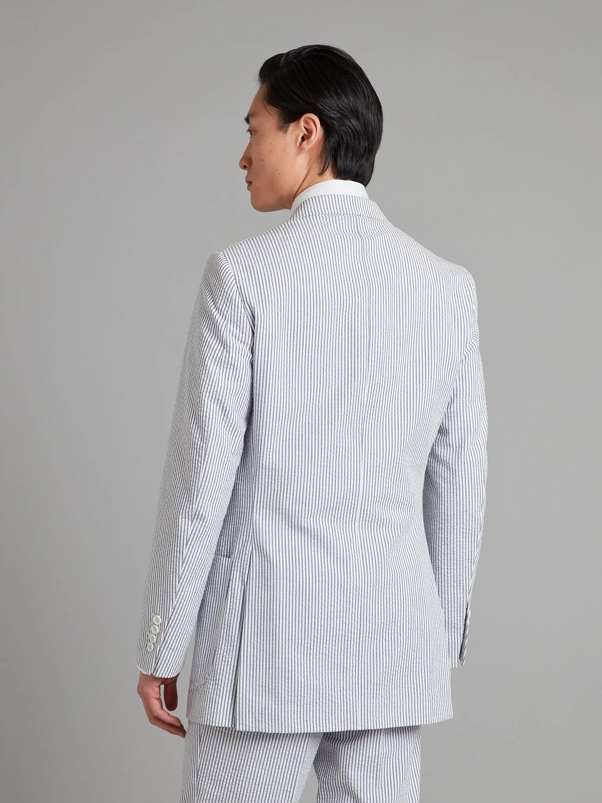 Our unstructured seersucker jacket in navy and white stripe is crafted from 100% cotton from Huddersfield. It sets itself apart with its unlined design, offering not only a relaxed and casual aesthetic, but also a garment that molds to your natural body shape. The interior and exterior are meticulously finished, showcasing attention to detail.