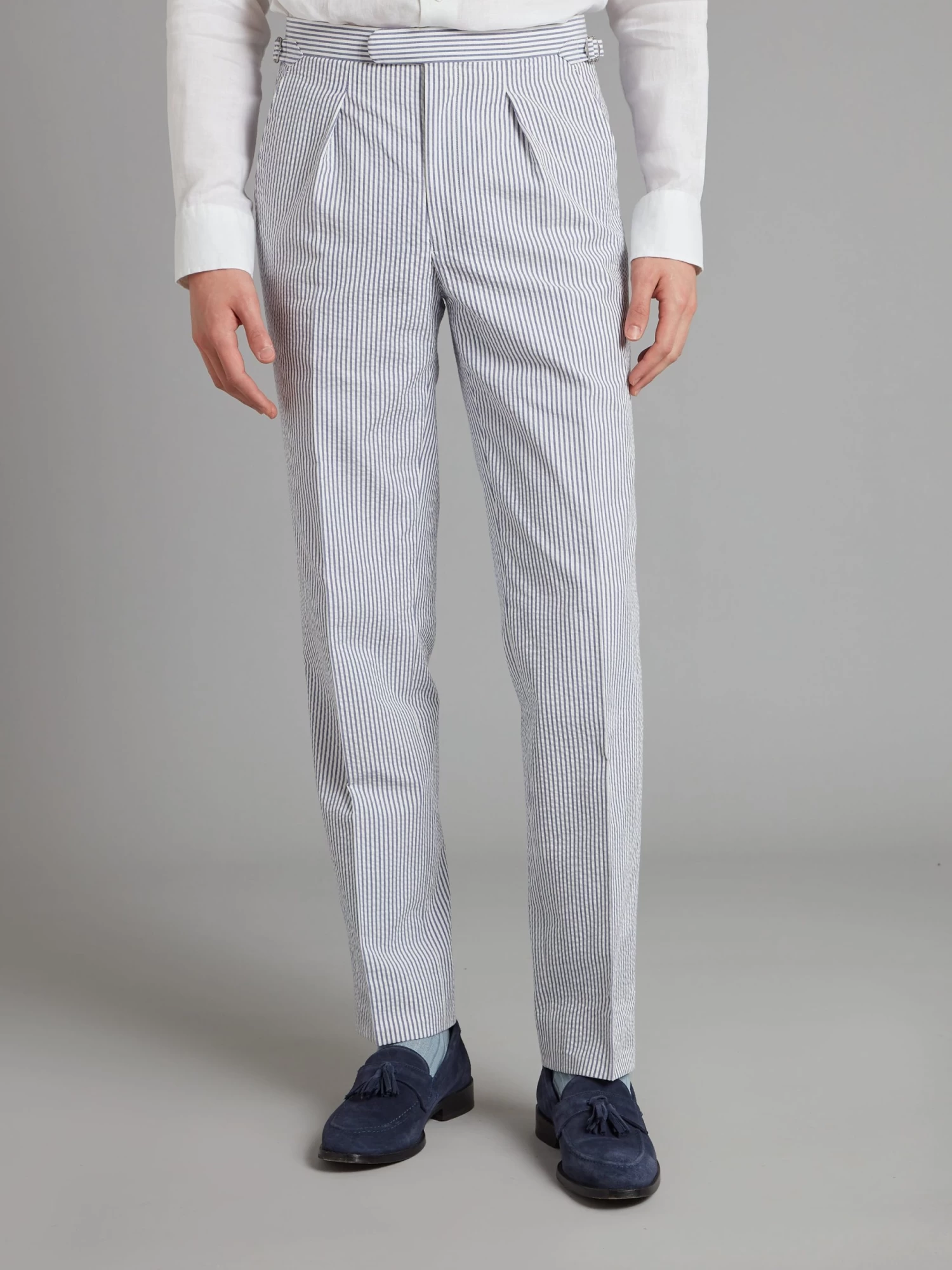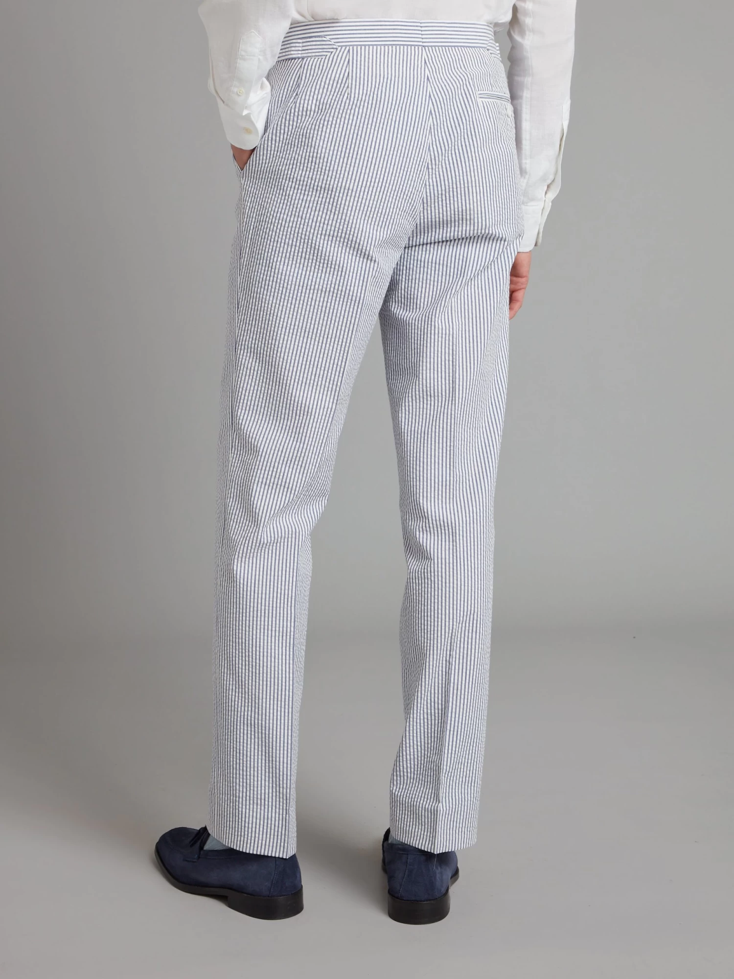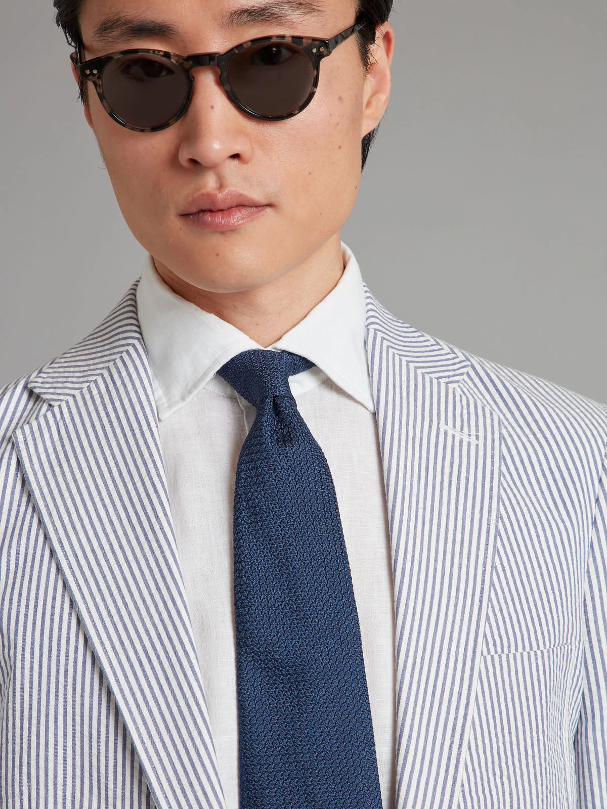 Our unstructured seersucker jacket in navy and white stripe is crafted from 100% cotton from Huddersfield. It sets itself apart with its unlined design, offering not only a relaxed and casual aesthetic, but also a garment that molds to your natural body shape. The interior and exterior are meticulously finished, showcasing attention to detail.