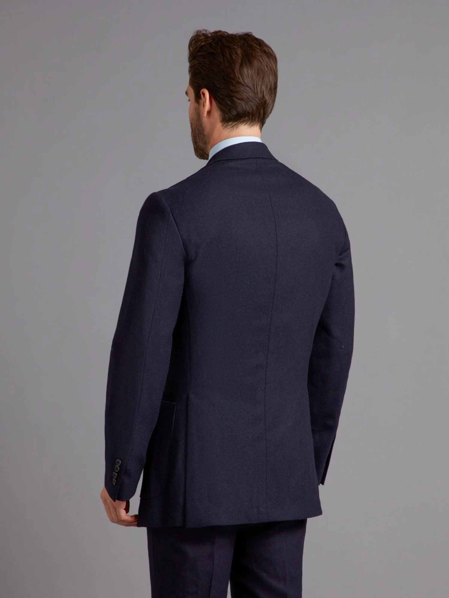 Our unstructured navy jacket is crafted from 100% wool. It sets itself apart with its unlined design, offering not only a relaxed and casual aesthetic, but also a garment that molds to your natural body shape. The interior and exterior are meticulously finished, showcasing attention to detail; it features patch pockets, double vents and four-button working cuffs.