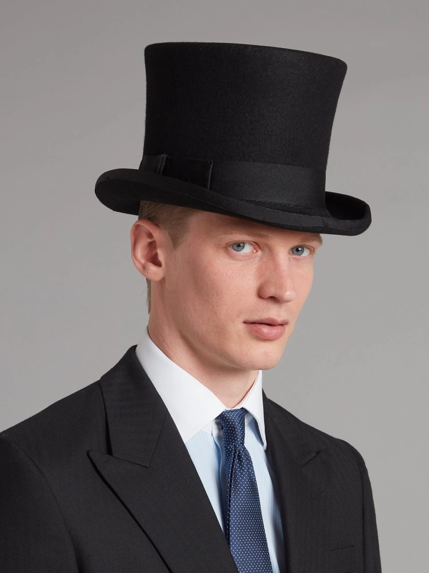 Oliver Brown specialises in top hats offering a substantial collection of beautiful antiques and contemporary alternatives. Hand-crafted of 100% wool felt, this hat is finished with a mourning band made of Melton wool and fully lined with white satin.